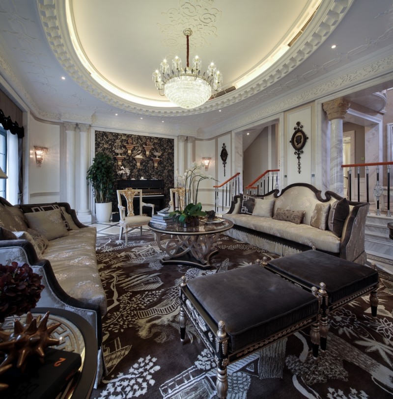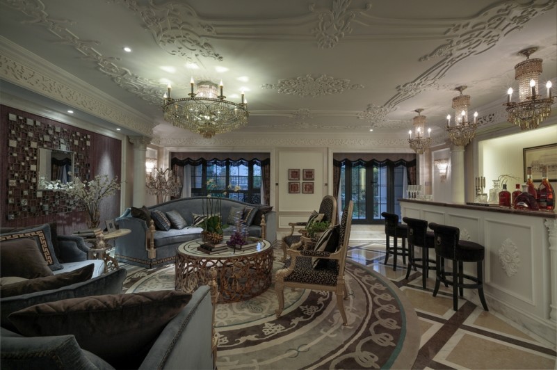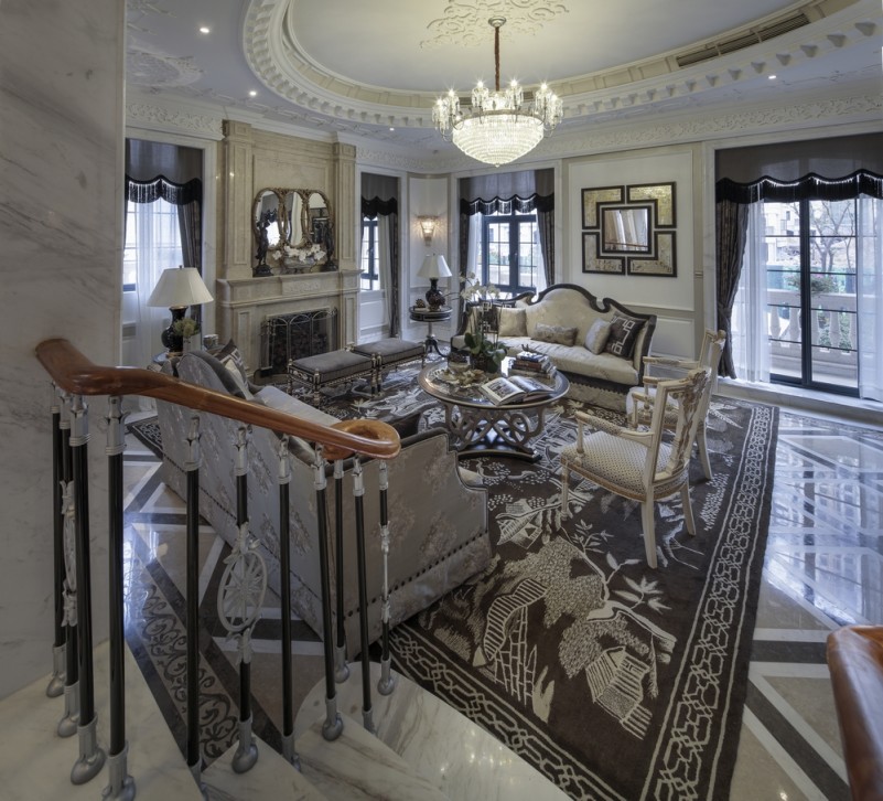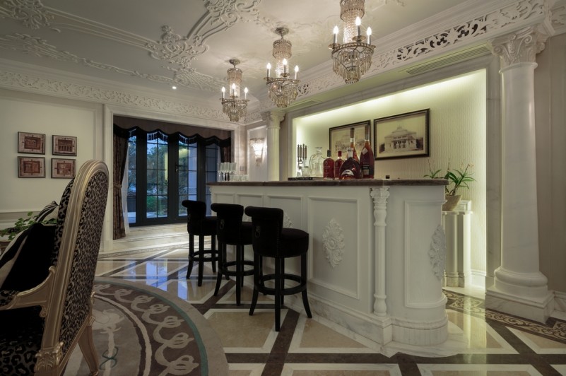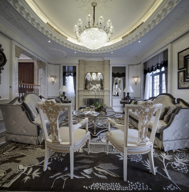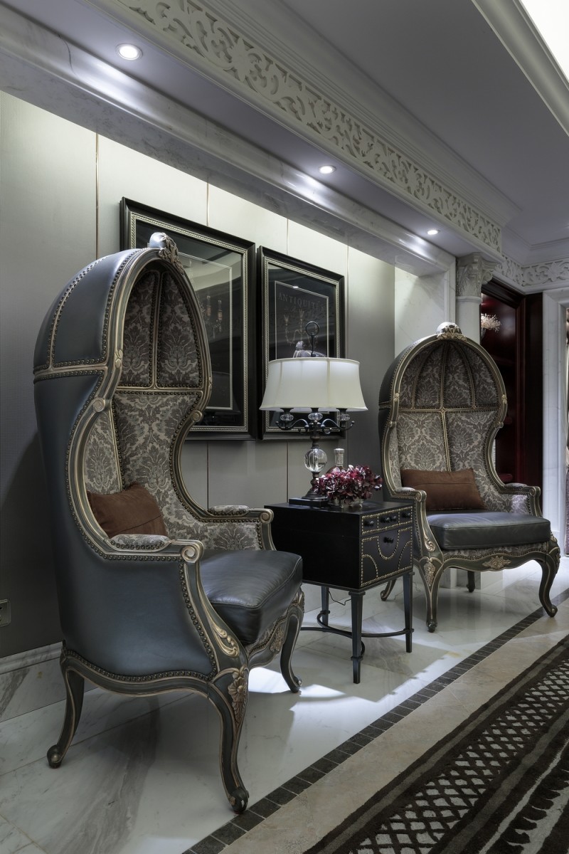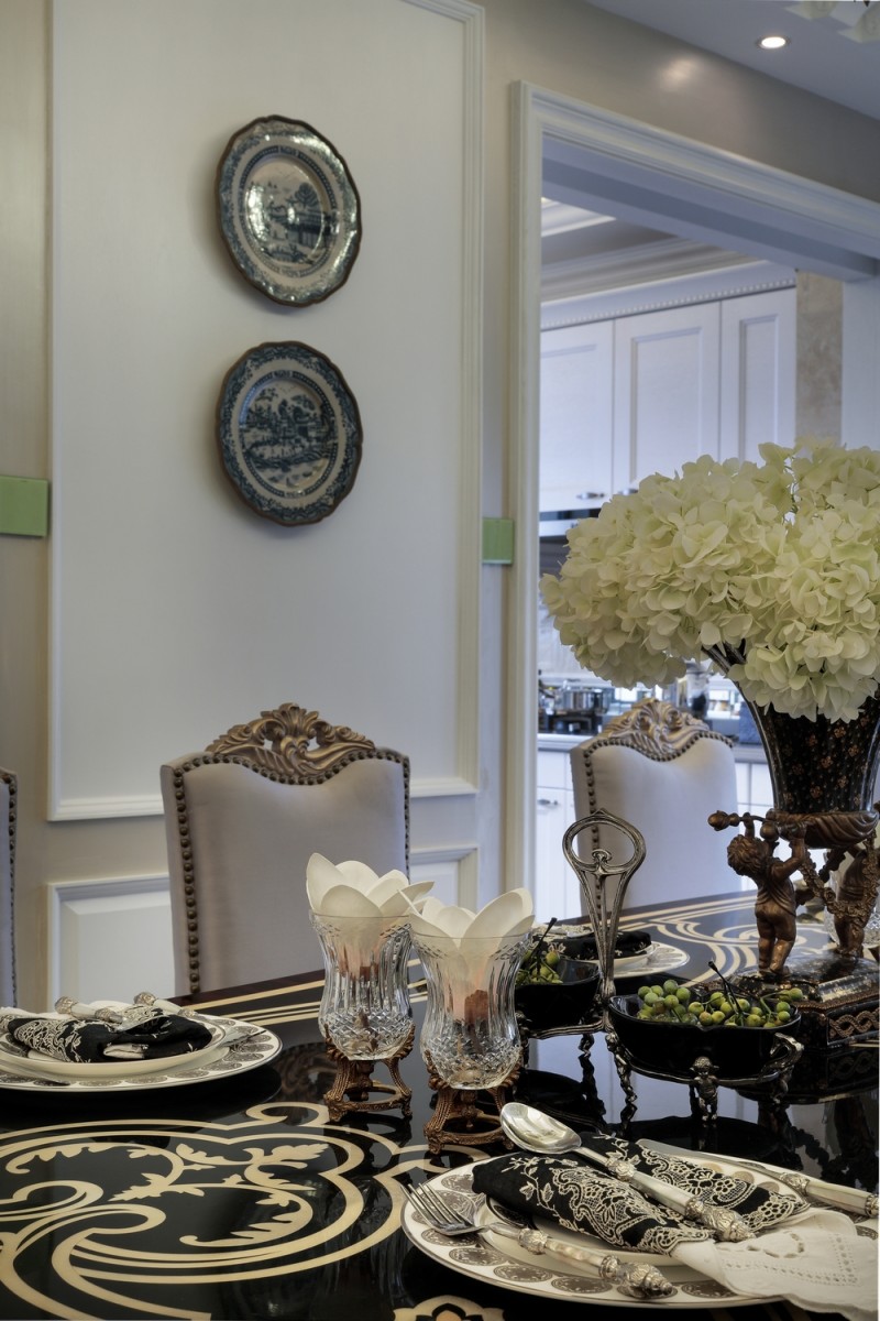 本案名為巴洛克戀曲,獨(dú)特的色彩切分是本案鮮明的特征,亦如探戈舞曲般節(jié)奏明快,熱烈狂放且變化無(wú)窮。法式風(fēng)格的基調(diào)配以墻體上浮雕感突出的石膏線,黑白