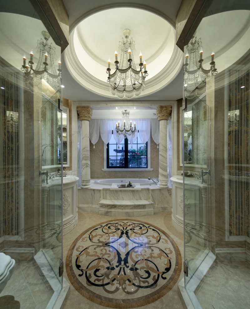 兩色大理石地面及紅色地毯的色彩拼接,猶如一對(duì)探戈舞蹈中的男女,將所有激烈的感情撞擊在一起、把所有的愛(ài)恨情仇交織其中。地板大理石拼花映襯著浴室中馬