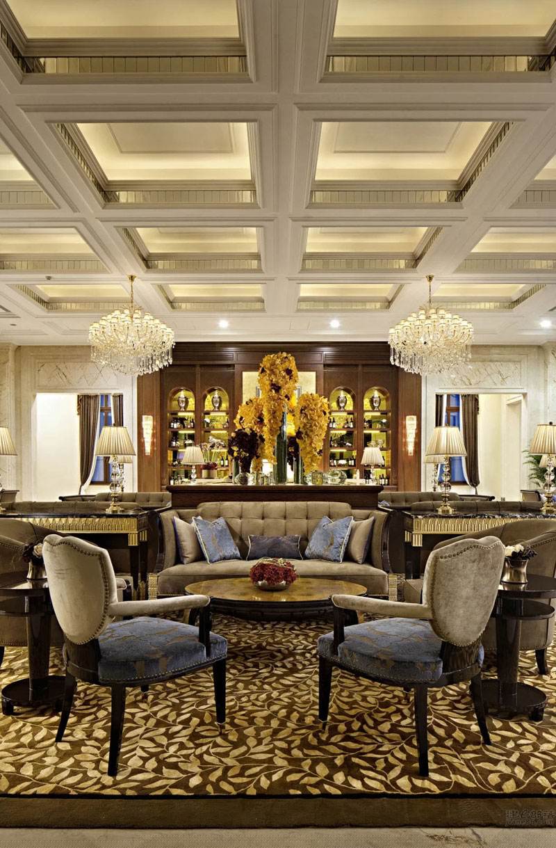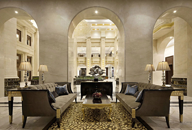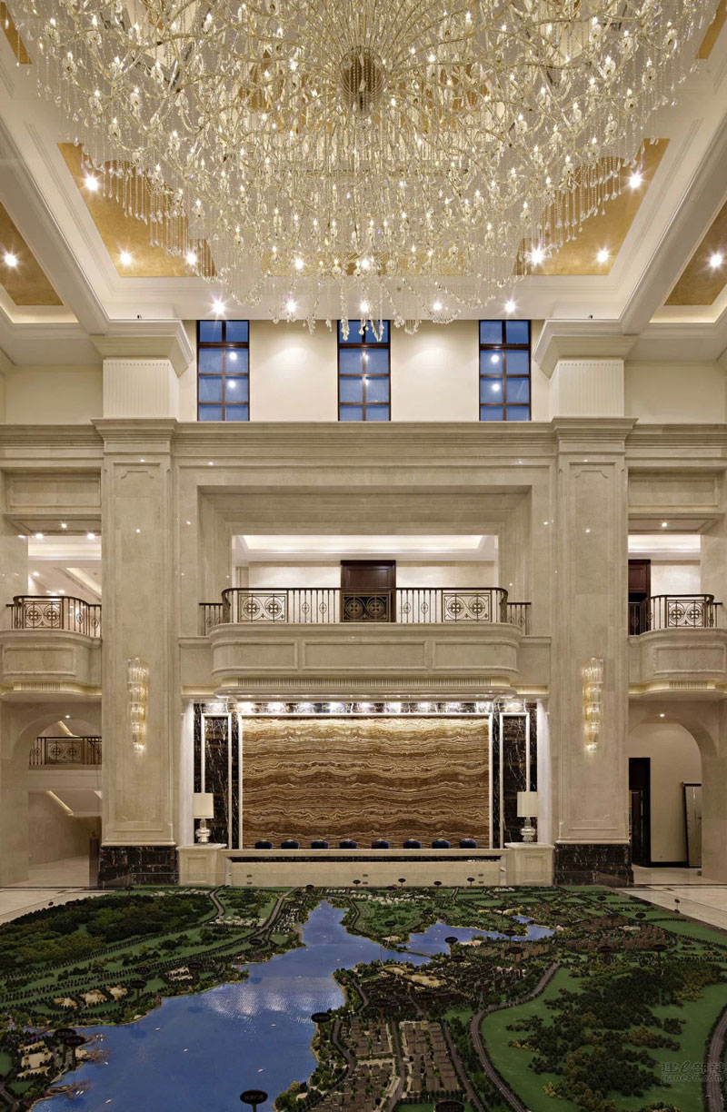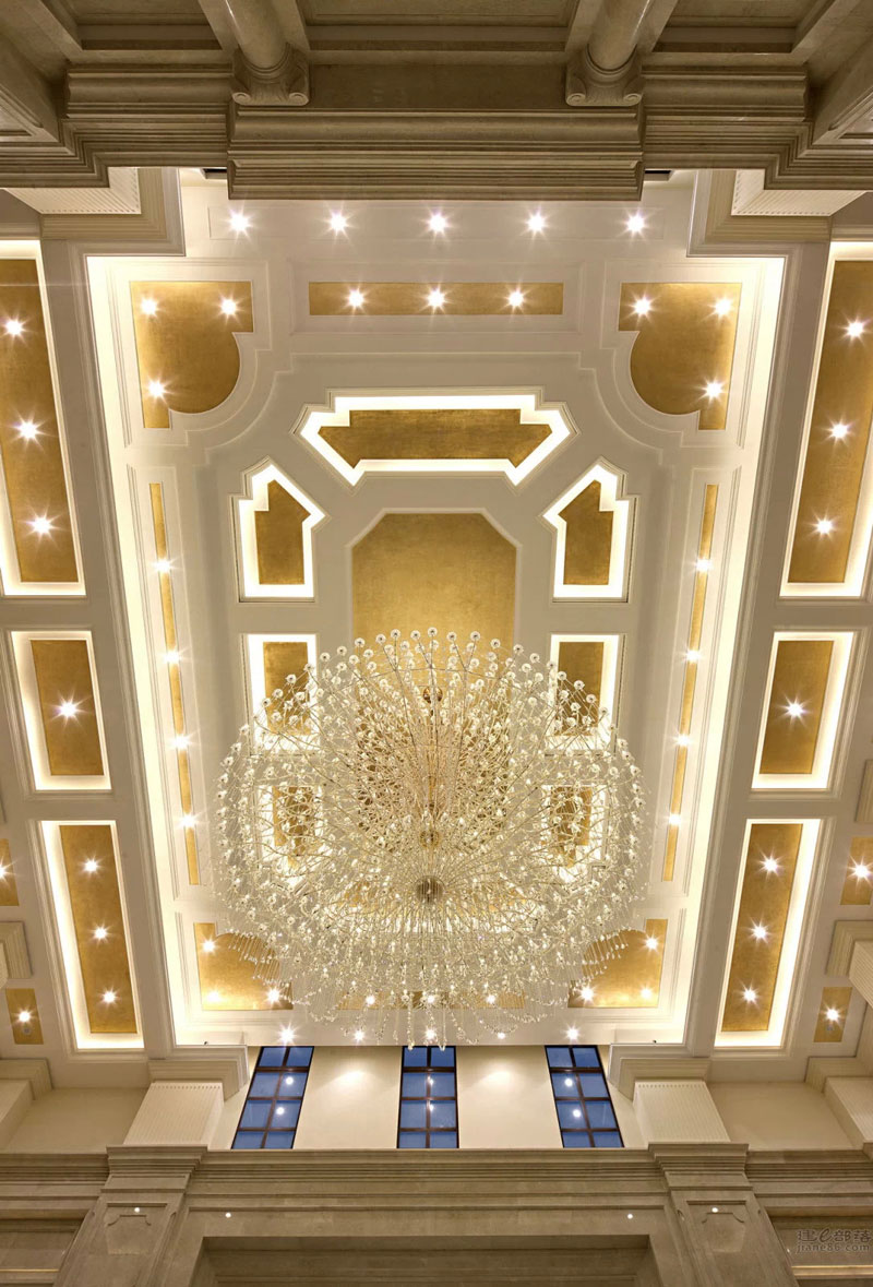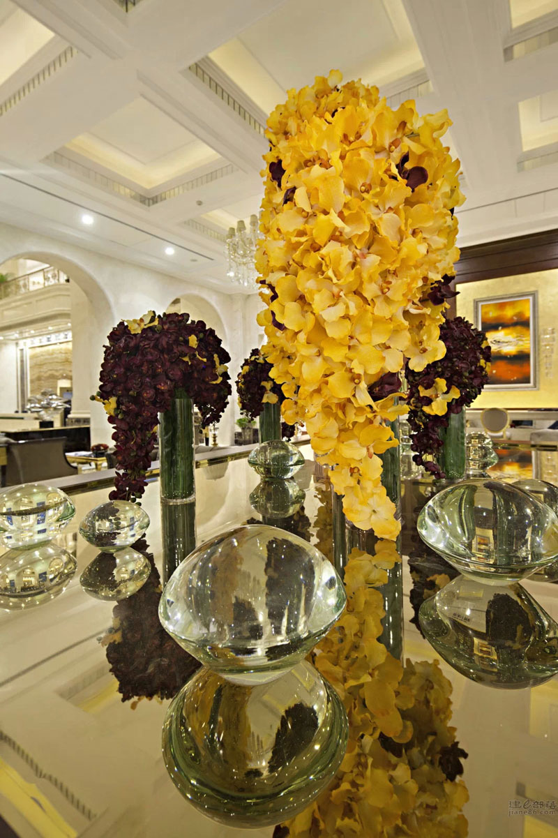 本案設(shè)計(jì)與外形建筑相呼應(yīng),柱廊、拱門(mén)、璀璨的水晶……法式浪漫的聯(lián)盟體。“樹(shù)影、鏡湖”是這個(gè)公共空間我們要表達(dá)的關(guān)鍵詞;眼睛平視的花藝裝置意喻為樹(shù);雕塑臺(tái)材質(zhì)為鈦金鏡面,意喻為湖;大小水珠灑落在湖面上,晶瑩剔透;灑落一地的金黃色葉子慵懶的飄在湖水與倒影中;顏色各一的抱枕活躍在超長(zhǎng)的沙發(fā)上;大人小孩盡情玩耍、嬉戲……景由心生,讓我們帶上家去旅行吧!