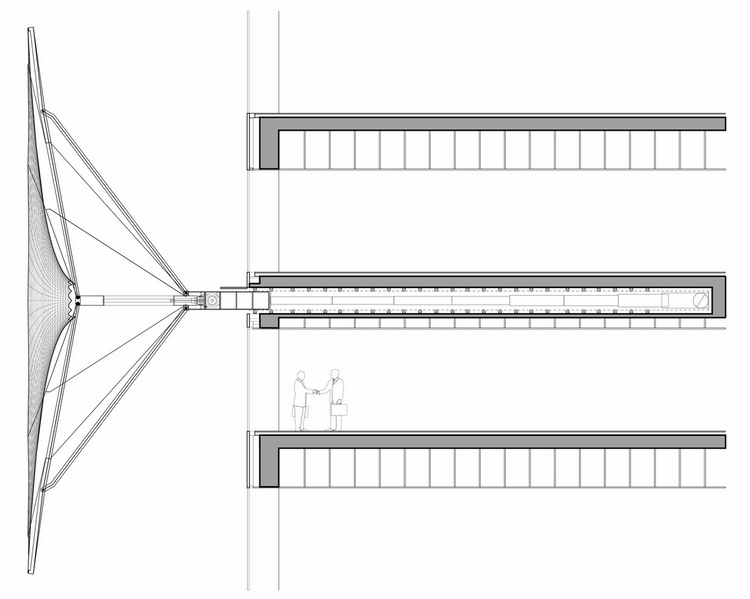 這些遮陽蓬的直徑約為15m,可以快速投入使用,在幾分鐘的時間內(nèi)將建筑的玻璃立面轉(zhuǎn)化成為“綻放”的受庇護(hù)的大樓。
