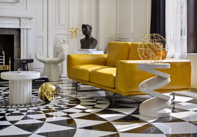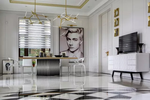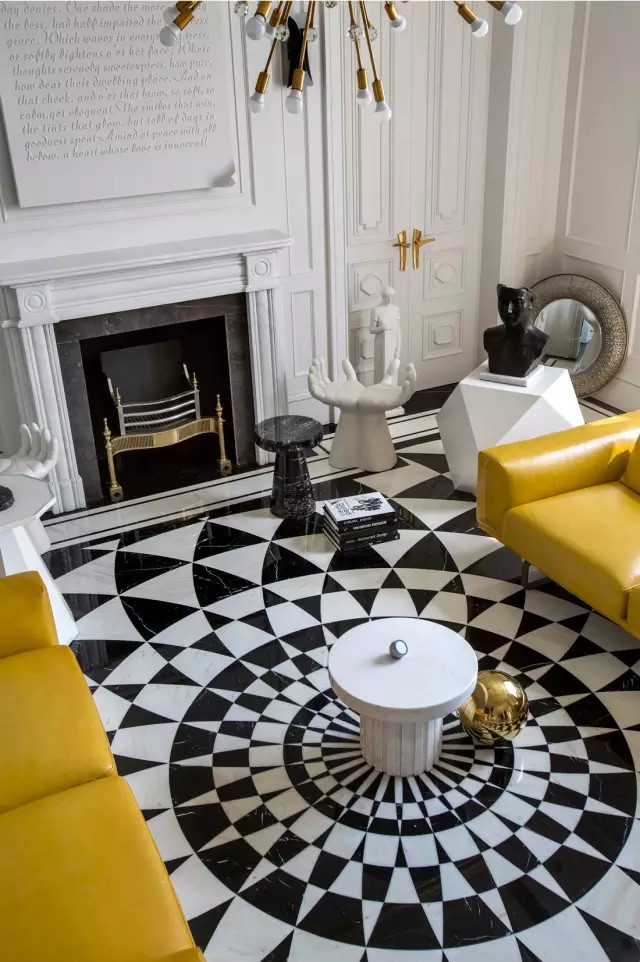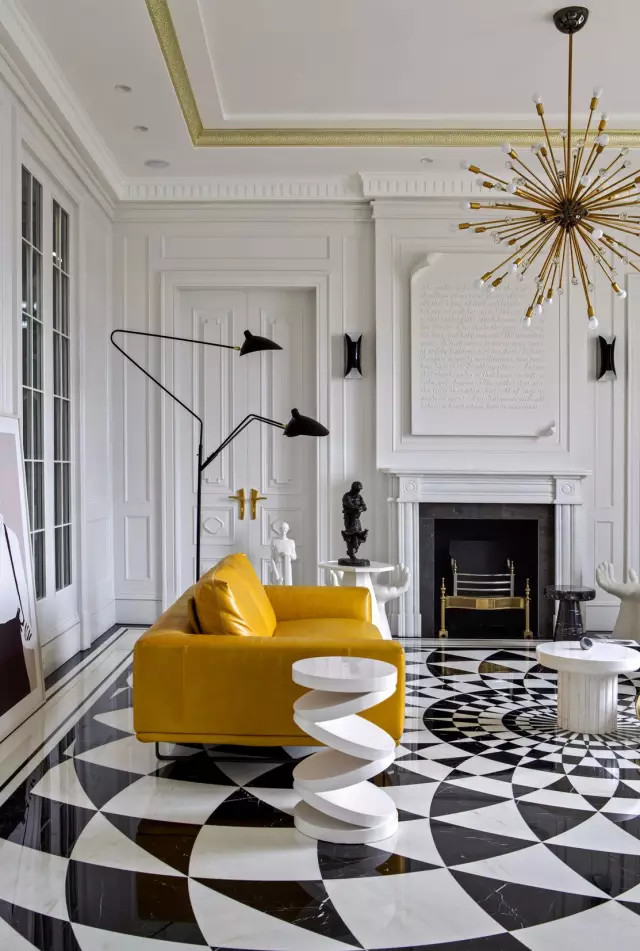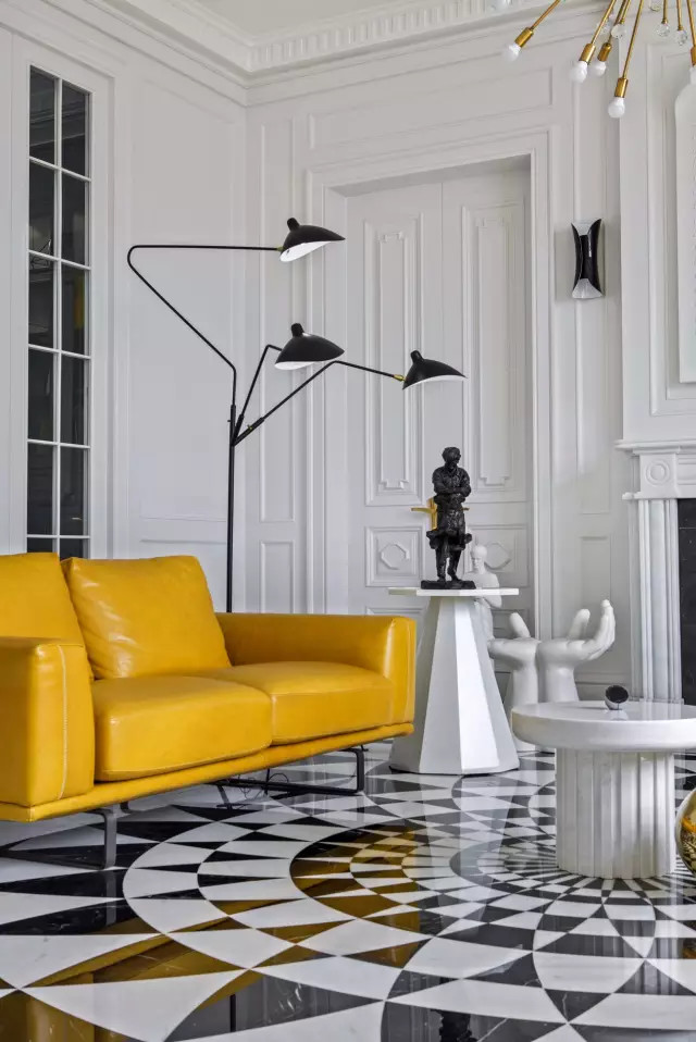 客廳時(shí)尚而前衛(wèi),量身定制的圓弧形大理拼花形成了獨(dú)特的視覺感受,簡明的黑白兩色的運(yùn)用,又在回轉(zhuǎn)間有了線面的對(duì)比,讓人真正體會(huì)到他在藝術(shù)中捕捉視覺之美的能力。