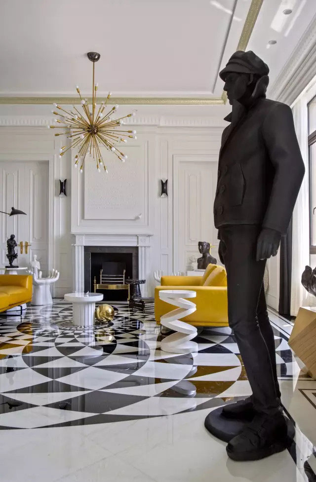 客廳用的是BF+D的復(fù)古爐芯,純銅做舊工藝來結(jié)合眼前那時(shí)尚卻又帶點(diǎn)歲月痕跡的英倫風(fēng)情?;剞D(zhuǎn)間我們被客廳中部的一位時(shí)尚的先生所吸引,衣領(lǐng)隨風(fēng)而動(dòng),帥氣的臉龐,修長的身形很是洋氣,原來是設(shè)計(jì)師為了提升整個(gè)空間的分量和厚重感特地塑造的雕塑形象,這2米多高的雕塑將整個(gè)視點(diǎn)推到了高潮。