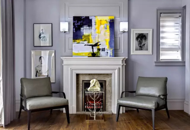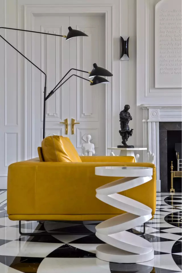 客廳內(nèi)高飽和度的明黃色沙發(fā)極為醒目,而素簡的壁爐與設(shè)計(jì)師自行設(shè)計(jì)的以英國詩人拜倫勛爵的愛情詩歌作主題,通過精巧的木刻制作,呈現(xiàn)出猶如翻閱的書籍般立體效果,格外別出心裁,不僅中和了這濃烈的色彩,還備顯整潔利落。