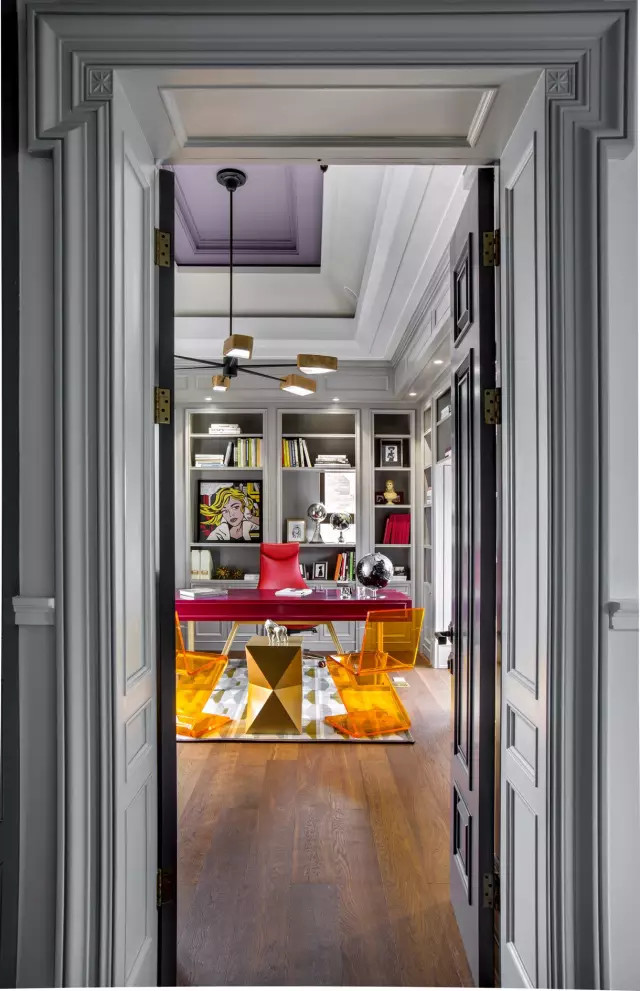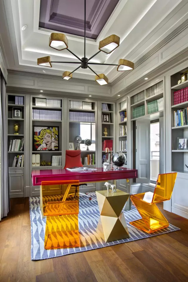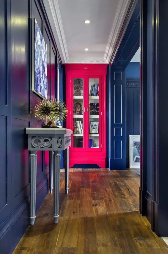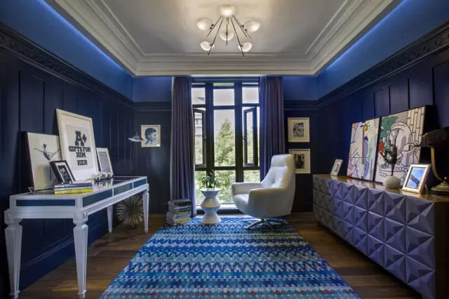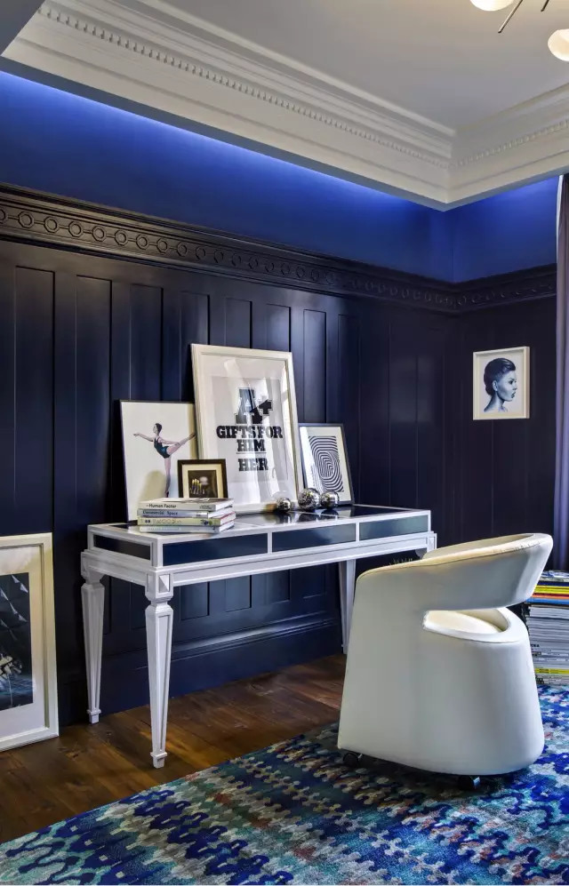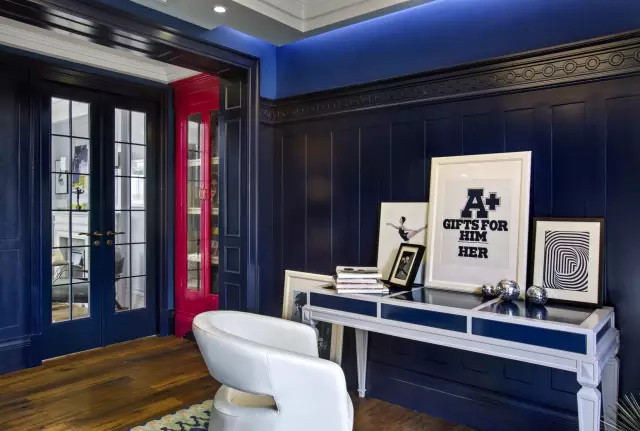 西邊的套間書房大面積的藏藍(lán)色飾面沖擊著玫紅色的壁柜,這樣的對(duì)比效果讓人興奮,整個(gè)書房沒有過多的裝飾,看上去非常的安靜,當(dāng)你坐在白色的沙發(fā),喝上一杯咖啡,看看窗外的景致,讓人產(chǎn)生無限的遐想。