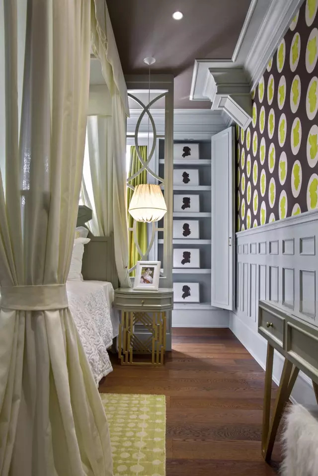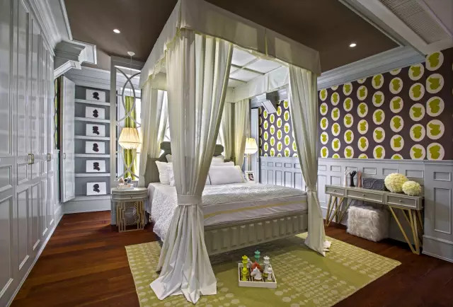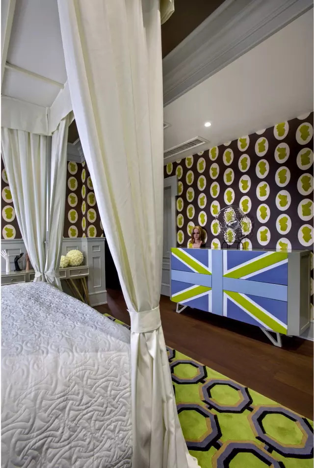 臥室以透空的木質(zhì)隔斷區(qū)分出不同空間區(qū)域??看安糠值男蓍e區(qū),讓人在閑暇之余可以靜坐在此瀏覽湖邊的風(fēng)景,微風(fēng)拂面是如此的愜意。而隔斷的另一端擺放著他設(shè)計(jì)的高柱床,整個(gè)都有米白色的床幔包裹,各式的配畫搭配著檸檬綠絨布的英國女王像壁紙,帶著令人遐想的意境。在墻面上眾多的收納柜中還暗藏一個(gè)樓梯,巧妙地連接臥室與閣樓兩個(gè)不同功能的空間。