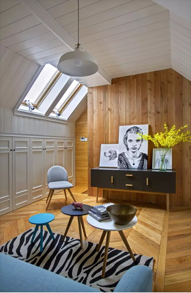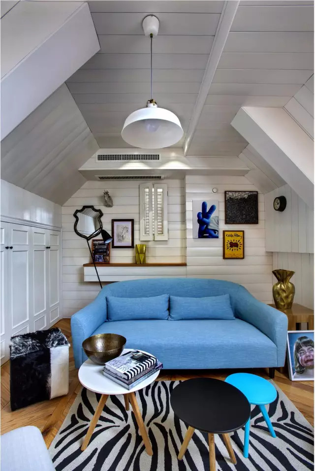 閣樓是預(yù)留的一間小客廳兼儲(chǔ)藏室。自制的魚骨地板搭配著柔軟舒適的地毯,各式各樣的裝飾畫和鮮艷的沙發(fā),壓力再大的人都不會(huì)再有煩惱。