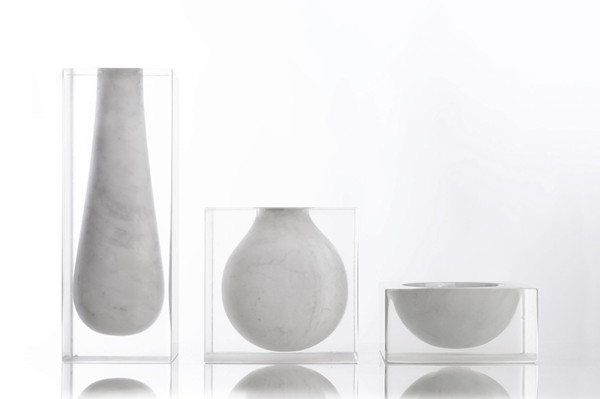整套中空大理石容器包括一個(gè)碗裝容器、一個(gè)球形花瓶和一個(gè)長圓形器皿。材料來自取芯過程中的廢料,這一系列作品意在突出材料本身,和了解如何能制作出獨(dú)特產(chǎn)品的工匠。