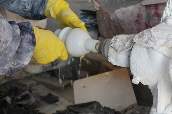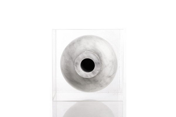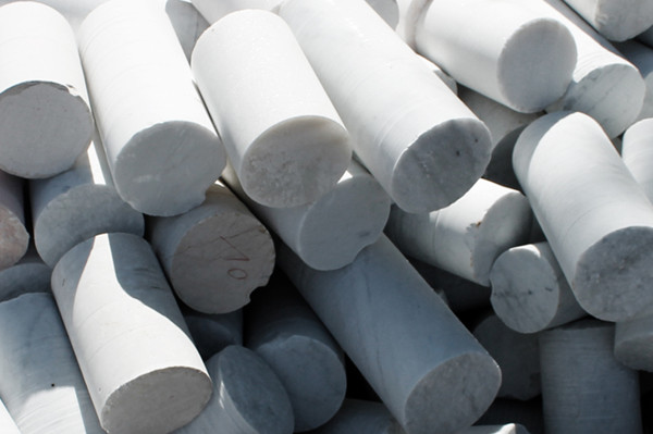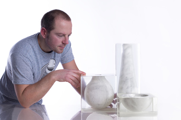 Moreno Ratti 選用了目前每噸價(jià)格在逐漸升高的卡拉拉白色大理石,并將這些容器裹以樹脂,如此一來,可在它們被切成 2~3 厘米的厚片之前增加材料的強(qiáng)度。「外層裹上樹脂,能增加大理石抵抗切割機(jī)的抗壓力?!筂oreno Ratti 說道。