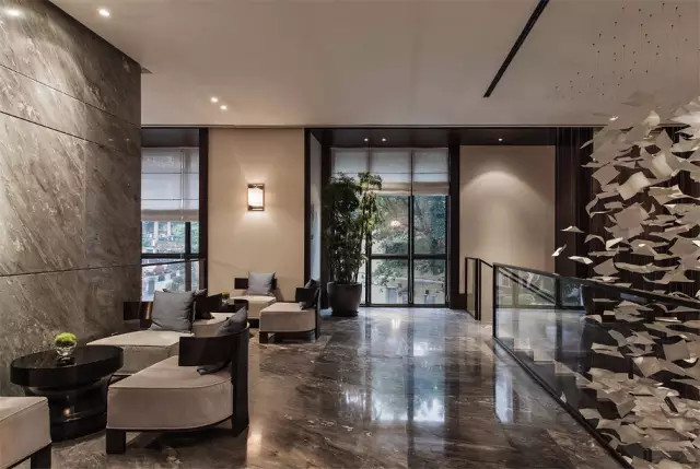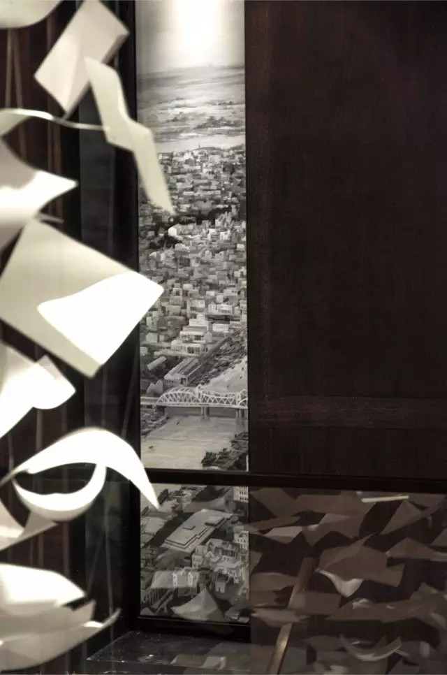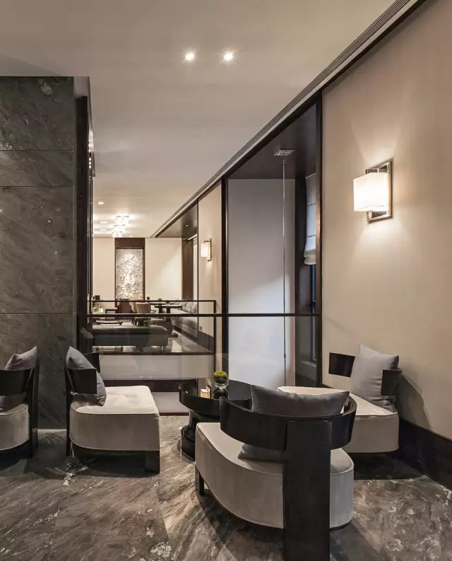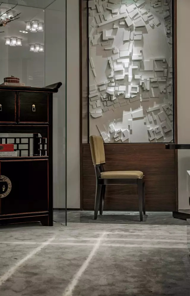 我們查找了很多廣州的資料和老照片,意圖在那些逐漸消逝或已經(jīng)消失的記憶里尋找設(shè)計線索,從一堆資料中提煉出可以借鑒和運用的元素,并從西關(guān)老宅中提取空 間的色彩和質(zhì)感組合:用老榆木地板、非洲柚木索深色模仿舊西關(guān)民宅老化的木色痕跡;灰色的藍(lán)貝魯石材替代做嶺南風(fēng)格必用的灰磚,模糊那些比較具象和符號的 套路元素;同時點綴大花白石材再現(xiàn)明清圈椅上鑲嵌白色云石的細(xì)節(jié)。用全新的材料推演出一個有抽象傳統(tǒng)記憶,但氛圍和細(xì)節(jié)卻具備現(xiàn)代情趣和品質(zhì)的銷售空間。