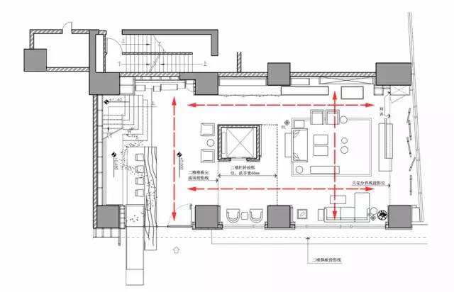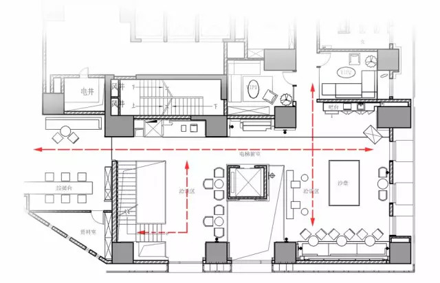 在空間構(gòu)成上,原建筑現(xiàn)場長而窄,碩大陣列的結(jié)構(gòu)柱,使不高的空間顯得沉悶和“儀式化”,無法體現(xiàn)設(shè)想中親切的銷售情境。去儀式,去“神性”用切割和構(gòu)成 來溶解結(jié)構(gòu)體量,我們利用樓梯和電梯打開兩個中空天井,把因為巨大的柱子而全部呈現(xiàn)豎向的空間橫切成互相交織的構(gòu)成關(guān)系,豐富上下空間的交錯融合,同時制 造上下兩層空間或人的“對話”可能,并通過這種組合把原本不大的空間“放大”。