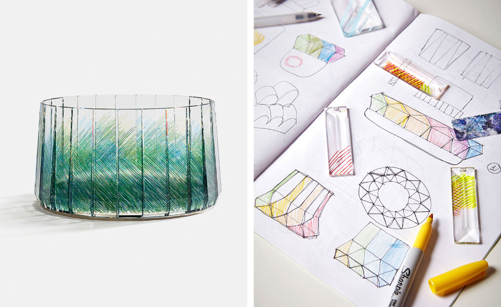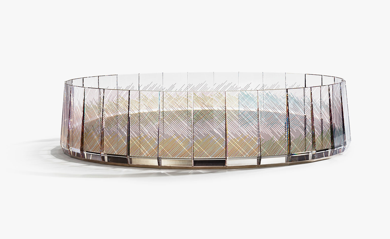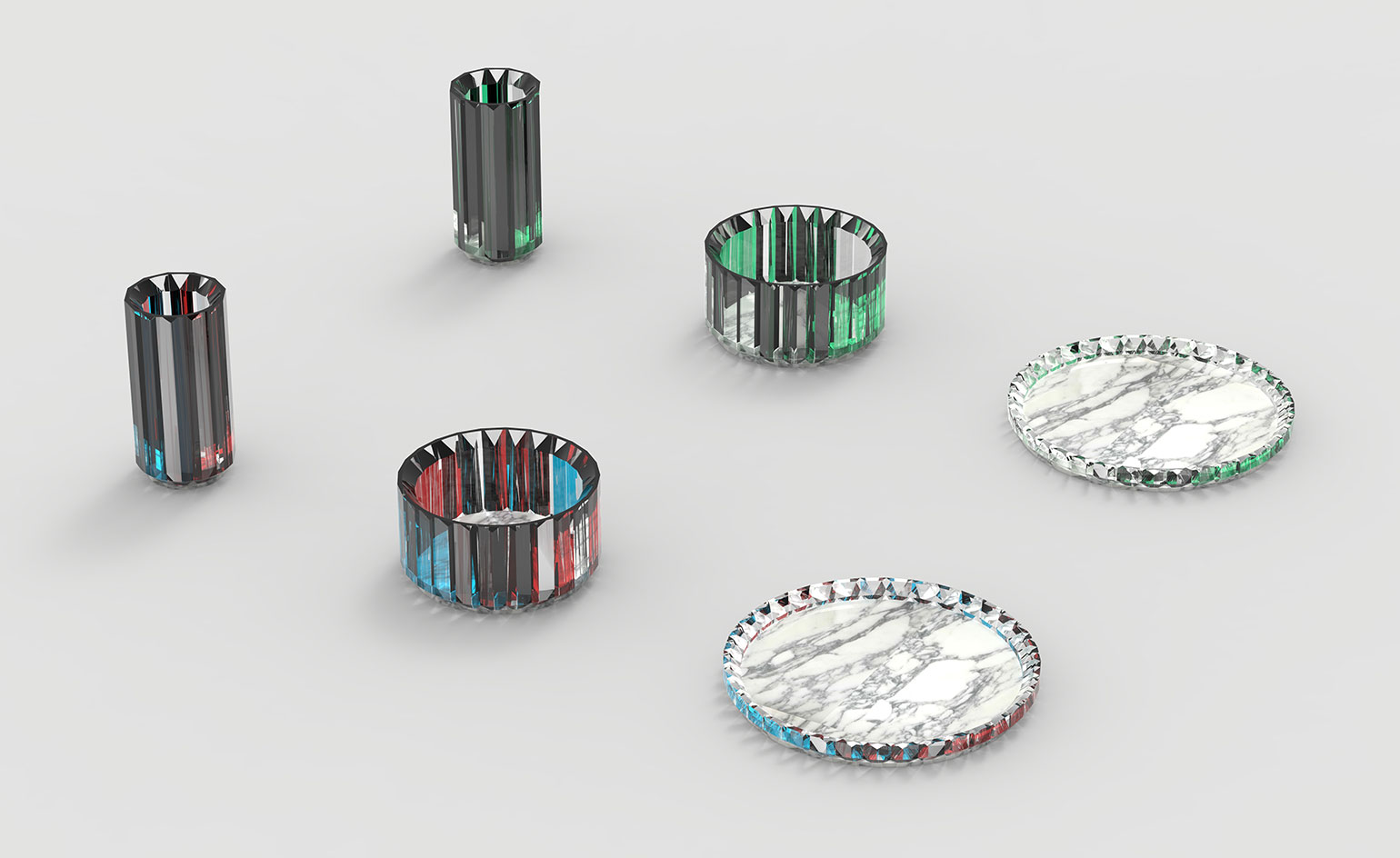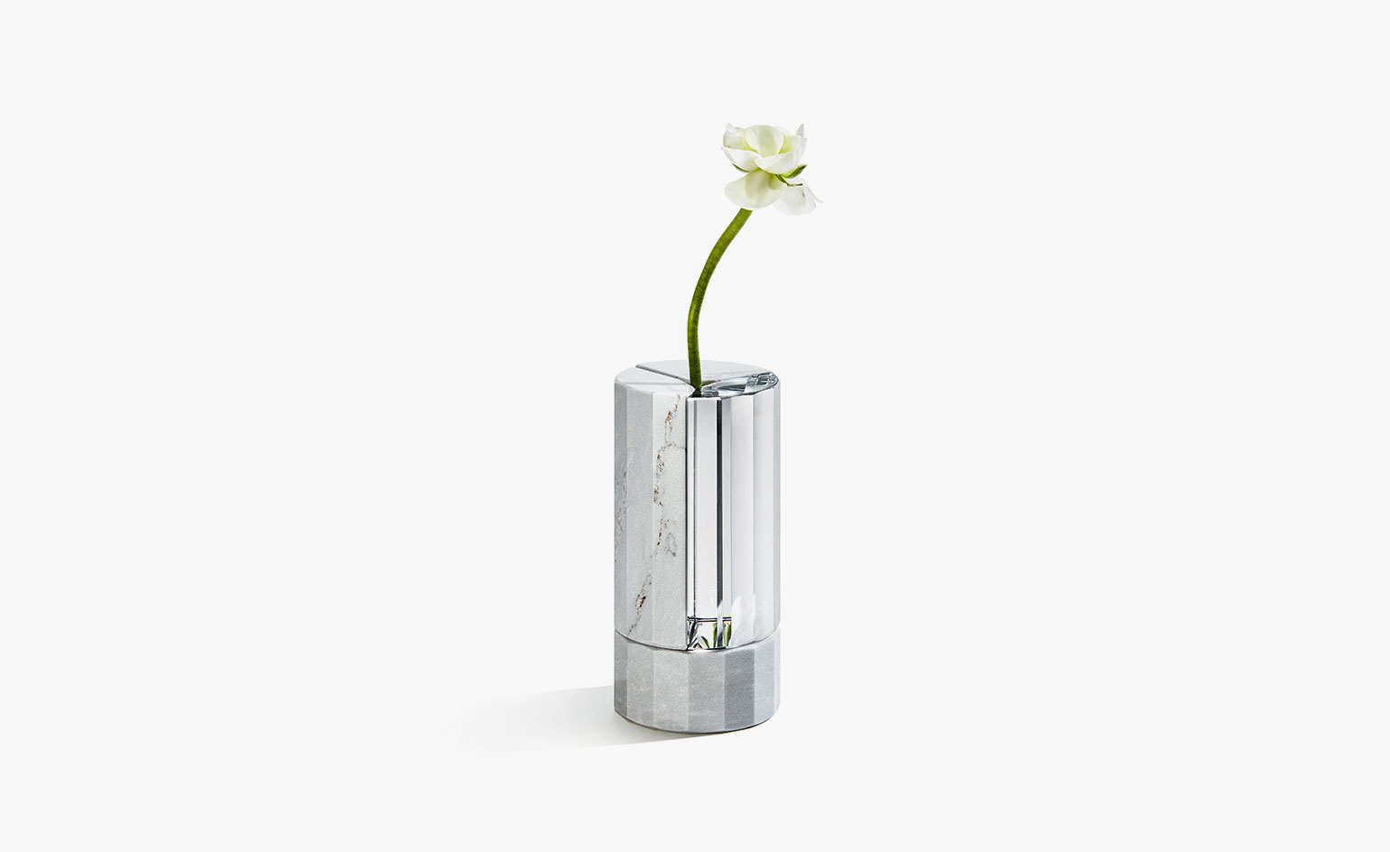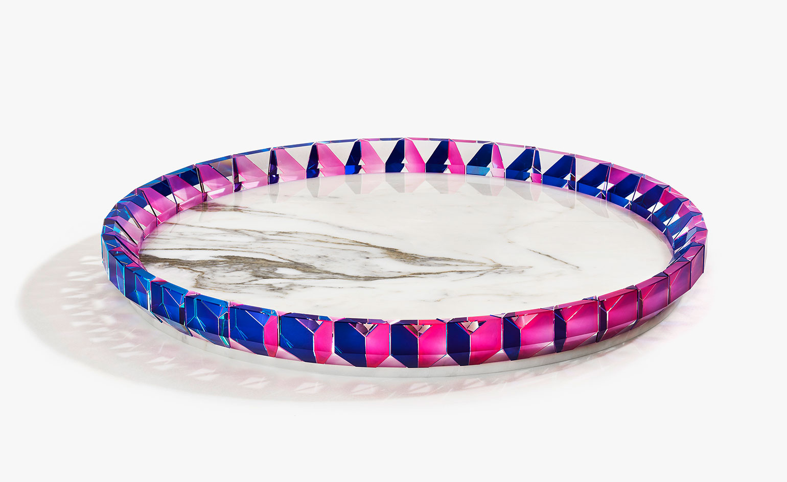 這當中,荷蘭設計師 Aldo Bakker 用大理石和水晶拼接成了一款花瓶,材質的對比和顏色的融合看起來十分有趣。Aldo Bakker 用這一件花瓶來表達水晶與大理石共同來自于地表之下,同根同源的關系;同樣是運用大理石元素,Tomás Alonso 用其標志性的鐳射膜包覆水晶并切割成棱鏡形狀裝飾在大理石底盤周圍,制造成了帶有夢幻效果的托盤和花瓶。