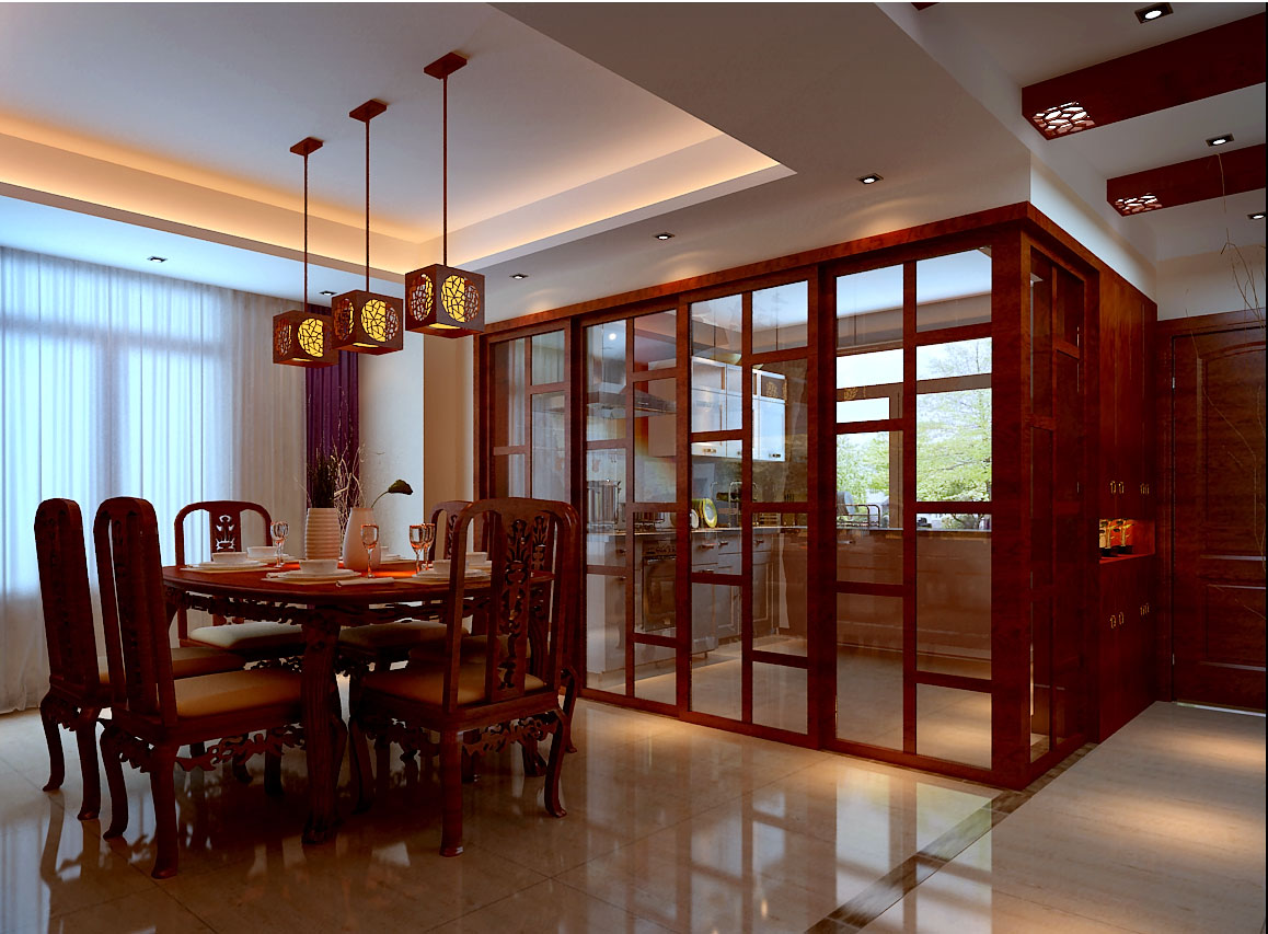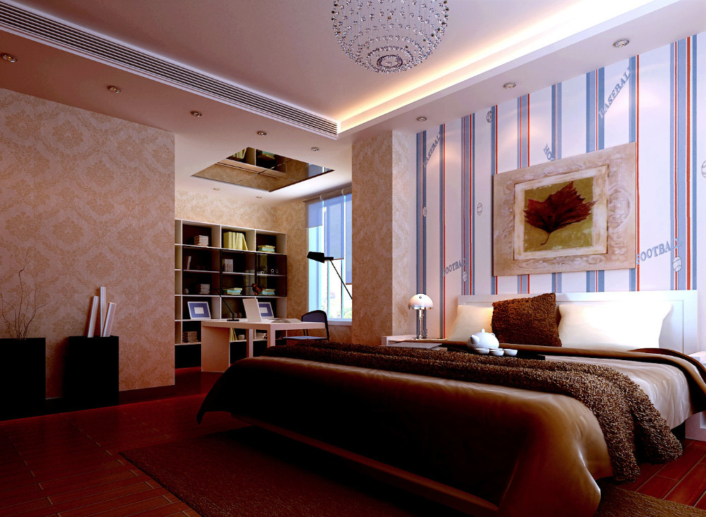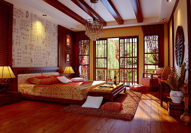 主臥的色調(diào)延續(xù)了客廳的配色,在沉穩(wěn)的基色中點綴了些許中國紅?!案!弊值膲埮c木色的搭配更顯簡潔、舒適,而一系列富有東方色彩的家具飾品詮釋出空間的精神。