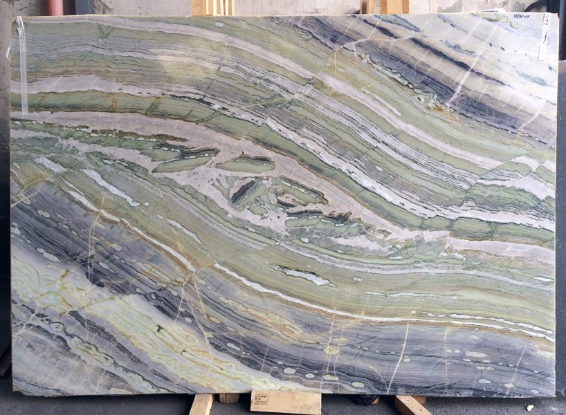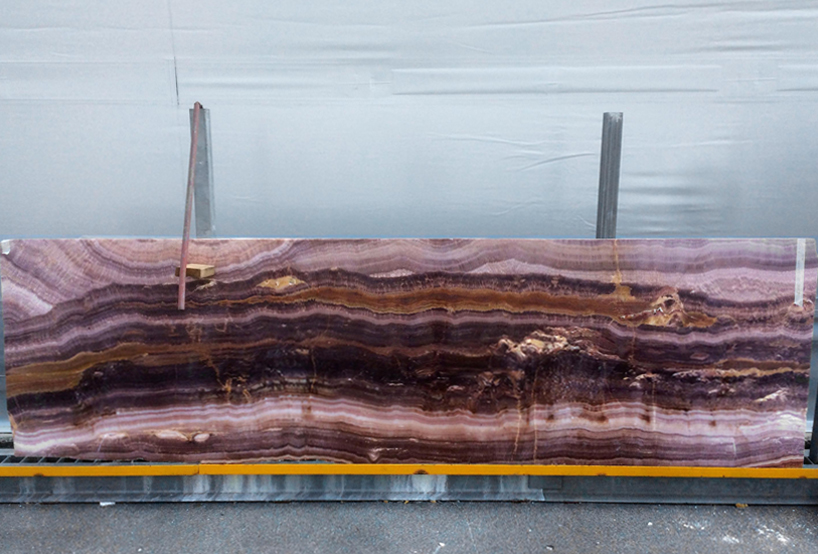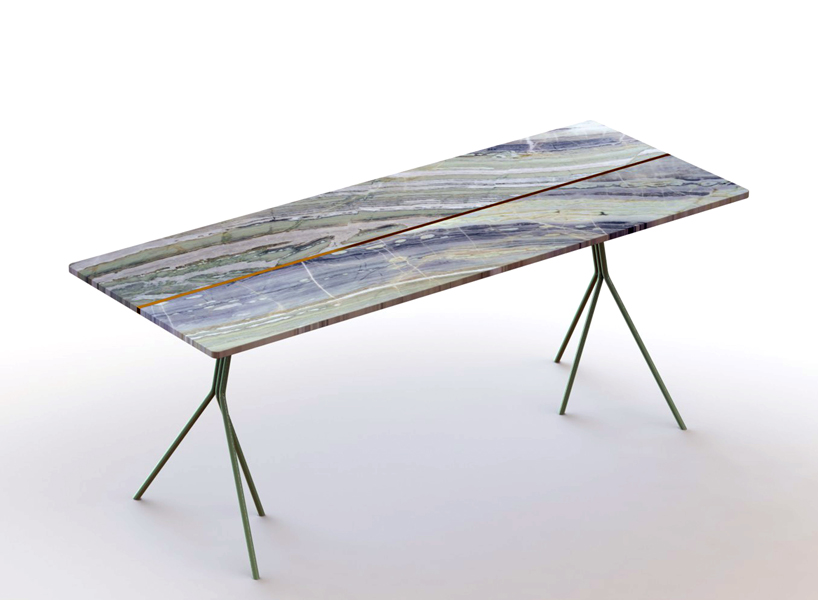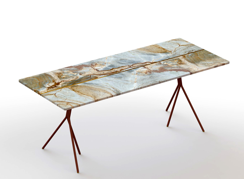 francesco meda創(chuàng)作的“split marble”(“分裂大理石”)桌由意大利阿爾卑斯山(Apuan Alps)兩種不同的大理石板構(gòu)成。該家具作品使用磨光的銅條框架將兩個分開的部分相連接。連接部分使用的是一塊羅馬藍大理石(blue roma marble)和河玉大理巖(river jade)。18毫米厚的石板下半部分以樹脂包裹 - 以確保較為明顯地突出大理石紋理。桌子表面呈現(xiàn)出材料所含的復(fù)雜層面,揭示了原碳酸鹽礦物顆粒發(fā)生再結(jié)晶引起的變質(zhì)過程。