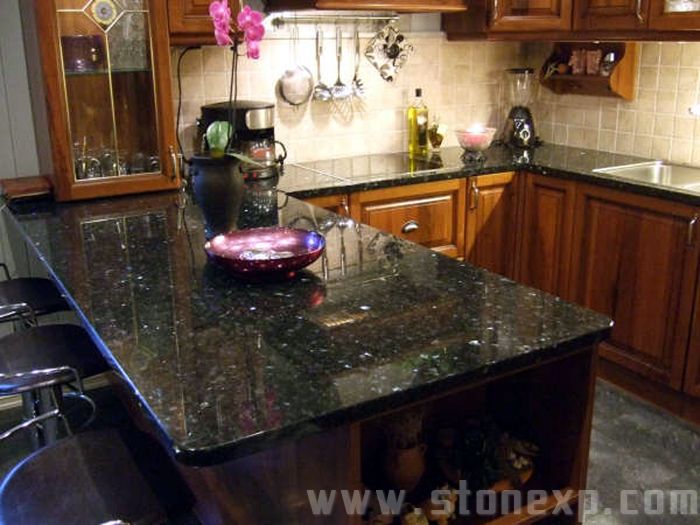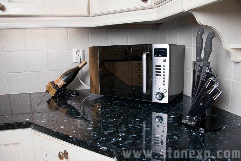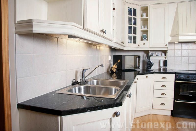 簡單描述:此組廚房的臺面板由天然石材鋪貼,神秘的黑色中閃爍著貝殼般的亮片,平凡之中透著不平凡,整體獨(dú)特,黑色石材耐臟及易清潔。