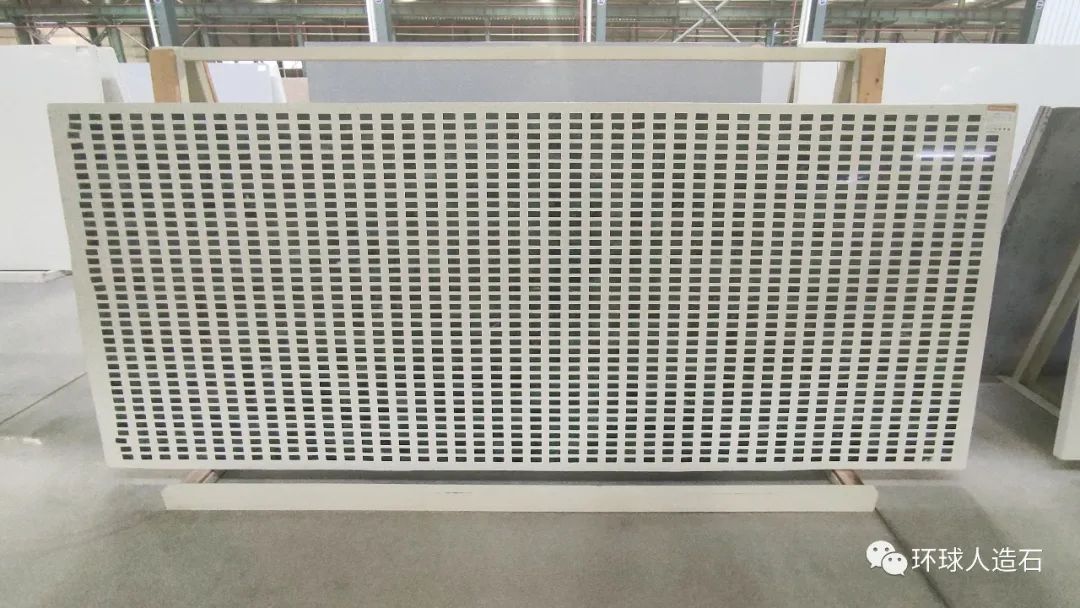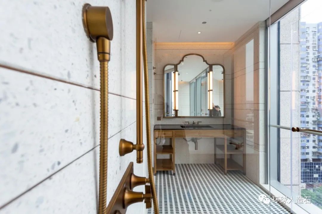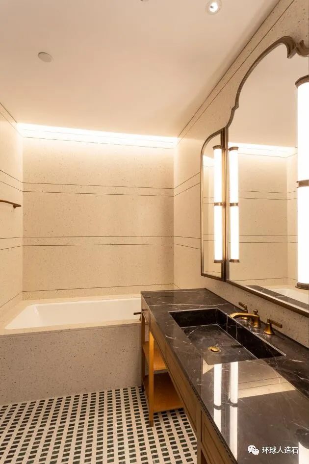 寬敞的衛(wèi)浴空間采用定制款白色無機人造石及一體成型的網(wǎng)格花色(將天然石塊陣列放置于磨具中,通過人造石生產(chǎn)線一體壓制成型,無需粘接,相比傳統(tǒng)的水刀拼接工藝更加高效、更加美觀)。