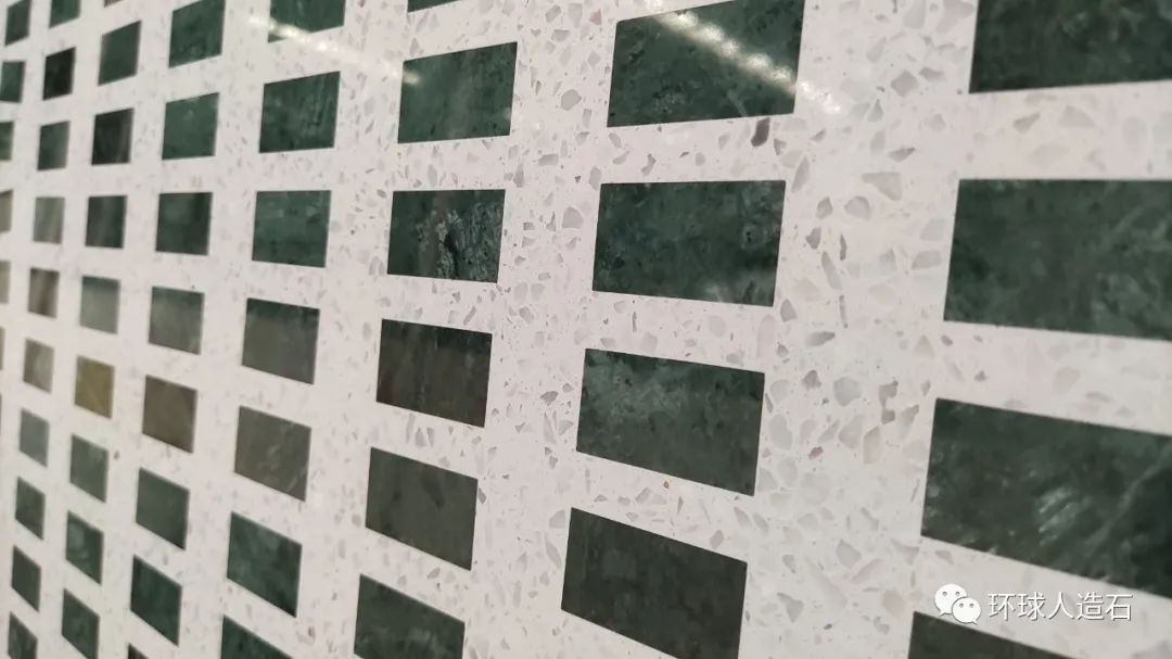 將稀有的綠色天然石和白色的無機人造石,切割成幾何圖形,完美的拼接融合成一件新的藝術(shù)品。