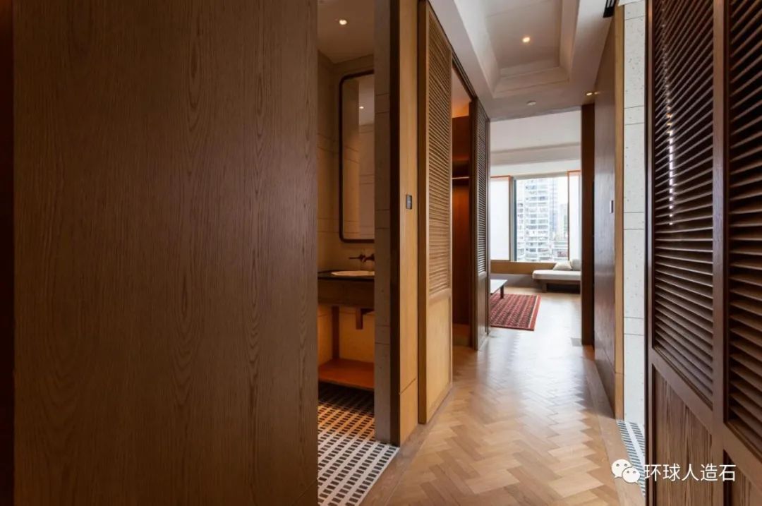 墻面采用超大規(guī)格的無機人造石,由上到下,渾然一體,簡約大氣。