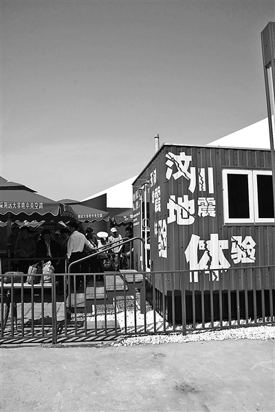 在遠大館外,建設(shè)者還專門設(shè)計了一個地震體驗屋。這間黑屋子從時長到烈度完全模仿的是汶川8級地震,前來排隊的體驗者絡(luò)繹不絕,記者也進去體驗了一把。地震剛開始時,屋子只是輕輕地晃動,隨后越來越猛烈,屋里的人不斷發(fā)出尖叫聲。地面晃動最厲害的時候,如果不是上面有扶手可以抓住,身體根本無法掌握平衡。到最后,屋子仍會輕輕地擺動,真實地告訴你余震仍在進行。