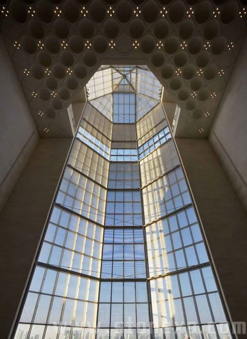 位于卡塔爾多哈的一個(gè)人工島嶼上的伊斯蘭藝術(shù)博物館,設(shè)計(jì)來自91歲高齡的貝聿銘,貝聿銘稱這個(gè)伊斯蘭藝術(shù)博物館將是他最后一個(gè)大型文化建筑(建筑外部在2006年已完成)。占地4萬5平方,白色石灰石幾何式的疊加成伊斯蘭的風(fēng)格建筑,中央的穹頂連接起不同的空間,內(nèi)部除了展示來自世界各地的各種伊斯蘭藝術(shù)品,還包括圖書館、餐廳等功能空間,開館時(shí)就有馬友友的表演。為了表現(xiàn)伊斯蘭建筑的本質(zhì),貝聿銘在中東考察了好幾個(gè)月,研讀穆罕默德,到埃及,去突尼斯。怕這個(gè)博物館會(huì)被周圍環(huán)境所淹沒,他請(qǐng)求卡塔爾的王儲(chǔ)為其建立一個(gè)獨(dú)立的島。