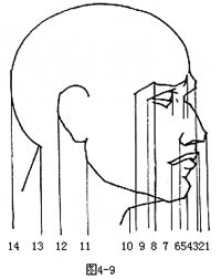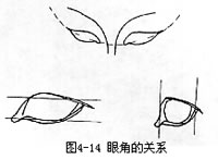 正面平視看一只眼睛的兩個眼角的關系是內(nèi)眼角低而外眼角高;側(cè)面平行看,內(nèi)眼角在前而外眼角在后,而且由于它附著在球體上,所以兩眼睛的四個眼角的連線應成一個弧形。(如圖4—14)