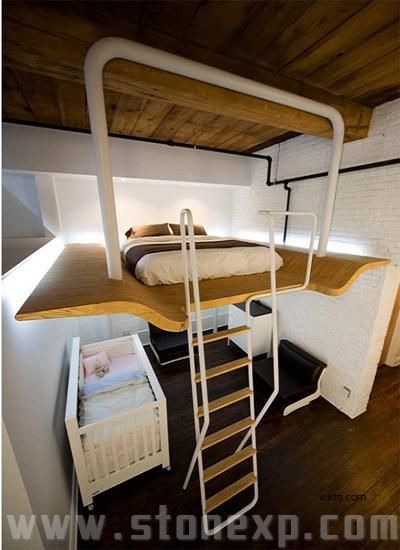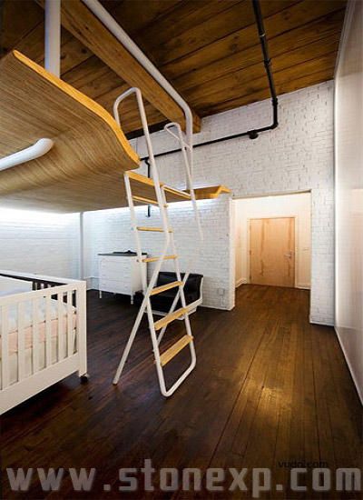 這個(gè)閣樓位于加拿大的蒙特利爾,總計(jì)面積700平方英尺,由L·McComber設(shè)計(jì)。因?yàn)樗麄冃枰ㄒ粋€(gè)房間給新生嬰兒,所以為業(yè)主專門設(shè)計(jì)了這個(gè)懸浮房間在新生嬰兒床上面。