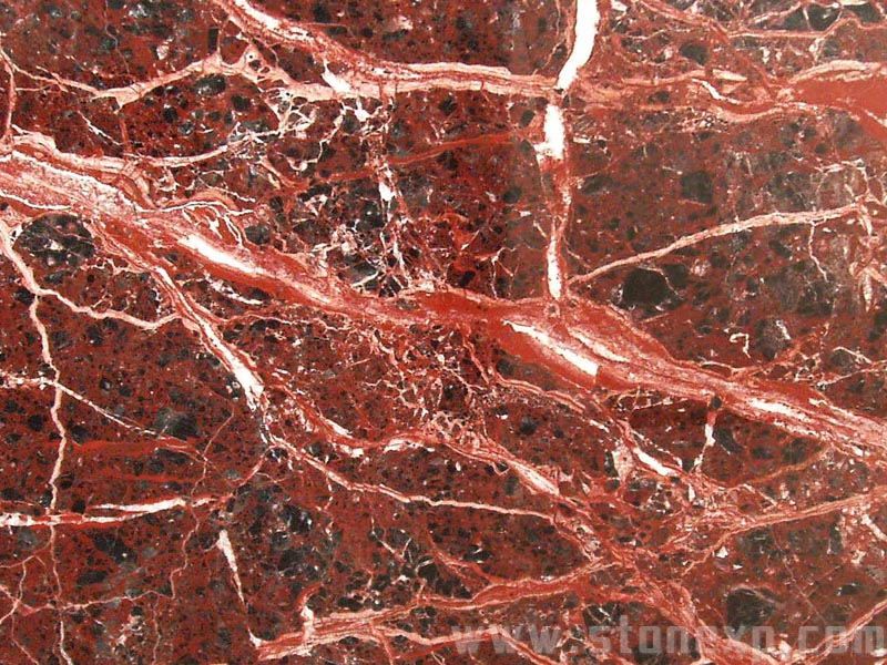 版面特性:花色鮮艷,底色鮮紅,紅、白兩花紋雜亂交錯,顆粒結(jié)構(gòu),有黑紋,國產(chǎn)料