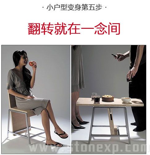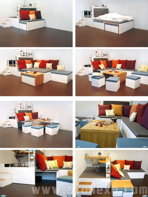 依你之見,這是個小戶型房子的會客區(qū)?沒錯,有沙發(fā)靠墊,有茶幾,這是個很標準的會客區(qū)。不過,集中精力,不要轉(zhuǎn)臺,繼續(xù)看下去…茶幾瞬間變成了餐桌,一堆矮凳從沙發(fā)底下鉆出來,變身成功!不過這還沒完…你想想,吃飽了玩兒累了,如果有一張寬敞的大床該多好!