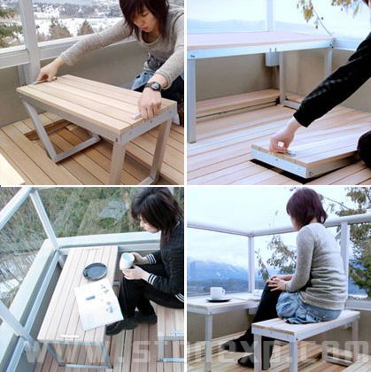 這個設計立意是這樣的:一個能為多人聚會提供平臺,但是在日常的時候卻可以縮減體積,減少居室空間的占用的桌椅系統(tǒng)。這個設計很完美的做到了這點,展開的時候,最多可容納8個人聚在一起喝喝咖啡聊聊天;折起來的時候,卻只占用房間里的一個角落。