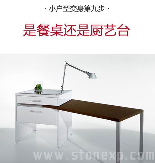 餐桌的一端,是個廚藝臺,可以切切菜,放放調(diào)料什么的。從圖里邊可以看出來,當矮桌部分完全收進去的時候,是很節(jié)省空間的。贊一個!
