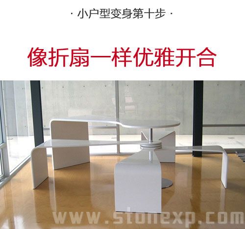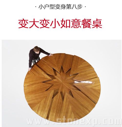 對于常駐人口并不多的家庭來說,準備一個剛好夠用的餐桌就OK了,太大面積的餐桌實在太占用餐廳的空間。但是如果你剛好有一手好廚藝或者有一個有一手好廚藝的主婦,常常喜歡在家里宴請朋友,一個足夠大的餐桌又是不可缺少的。怎么辦?這個看起來機關重重的桌子也許會勾起你的興趣,只需旋轉(zhuǎn)桌面,就可以隨意切換大小。