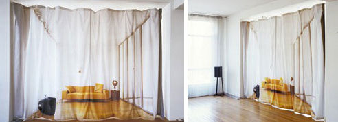 這片大大的落地布簾就是一個很巧妙的創(chuàng)意,很有縱深感的居室照片被印染到布簾上,仿佛一步便能跨過布簾進入到另一個空間。