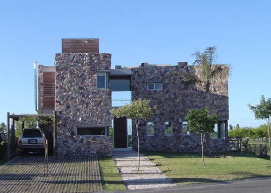 坐落于阿根廷,布宜諾斯艾利斯的這棟房子很有意思,整個建筑的外立面用的是天然材料,像是大石頭,還有木材,由承重墻和鋼架結構組成,使得花園更具敞開性。承重墻用的材料主要是石頭,可以起到更好的隔離和防水效果。