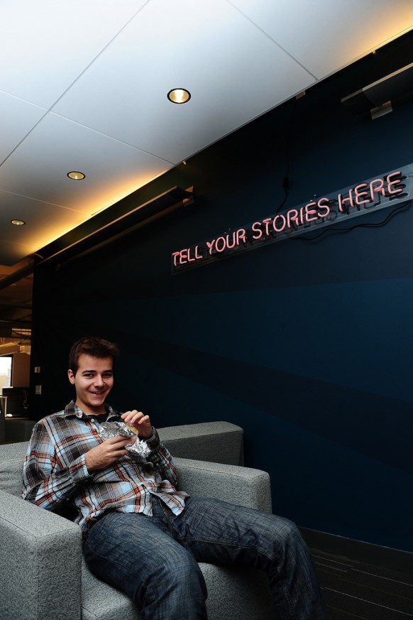 不久前,Twitter搬進(jìn)了舊金山的新辦公室,我們可以看到一些新的鳥類元素、鹿角、昆蟲等好玩的裝飾,還有寬敞的休息區(qū)、DJ臺(tái)。