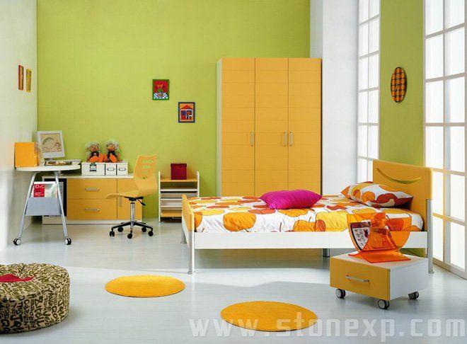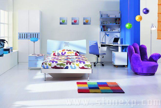 地面一般選較軟的材料,如木地板、地毯等。因?yàn)樾『⒆由院脛?dòng),選用這些材料對(duì)孩子的安全有了一定保障。色調(diào)也應(yīng)以明快、亮麗為主,避免沉悶,明快的色調(diào)可以使孩子性格開朗,開拓思維。