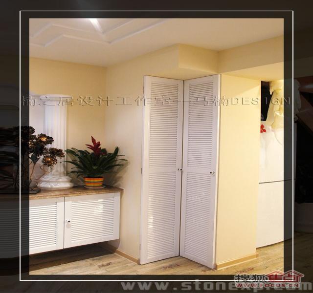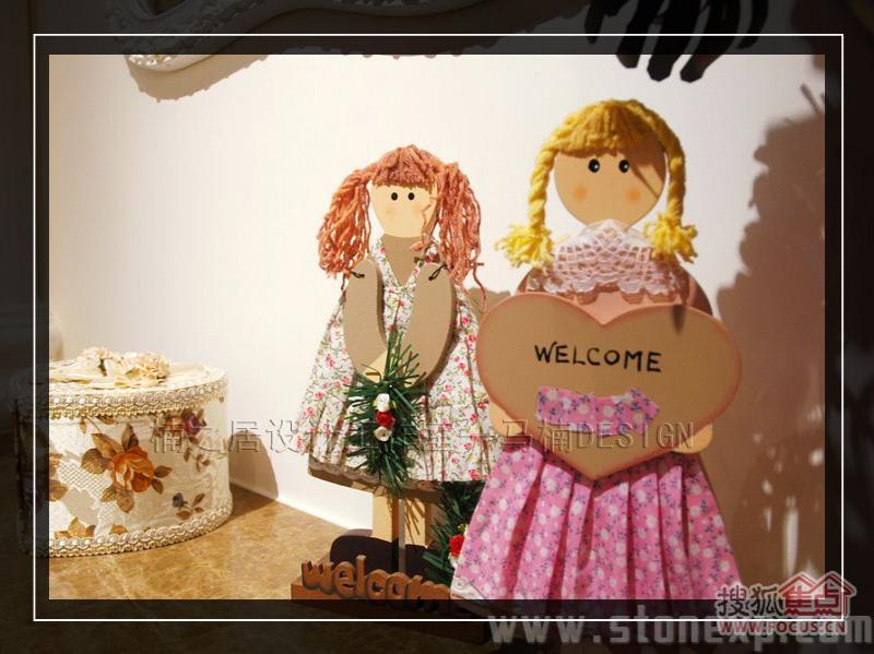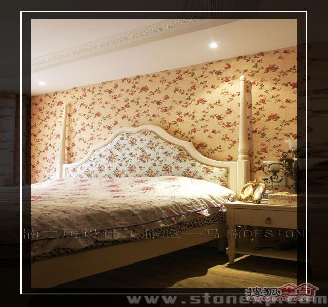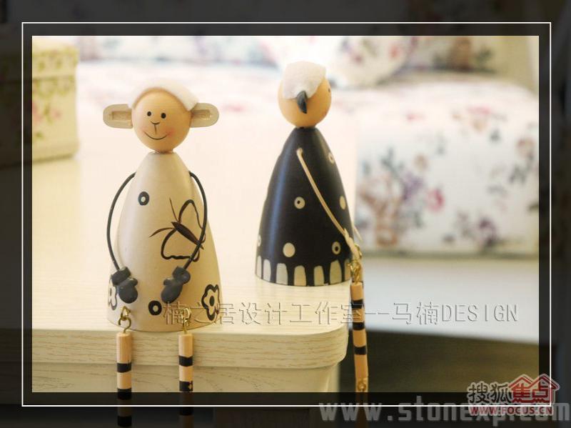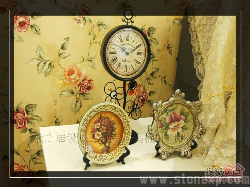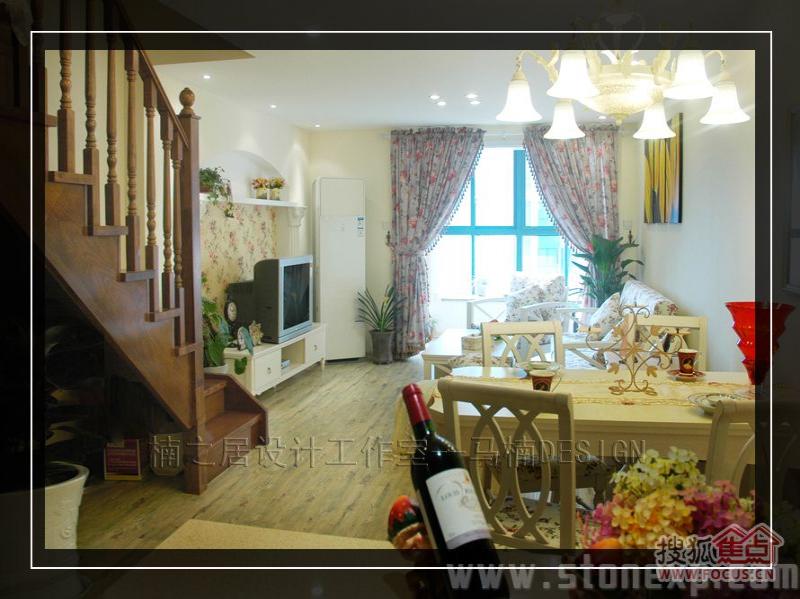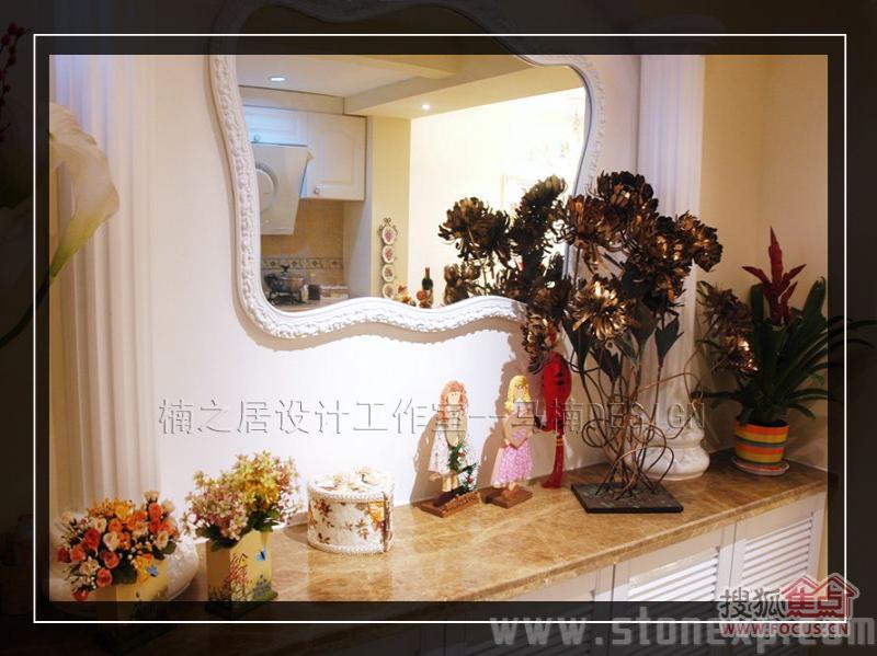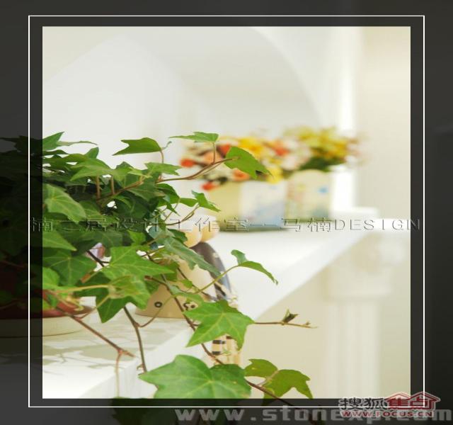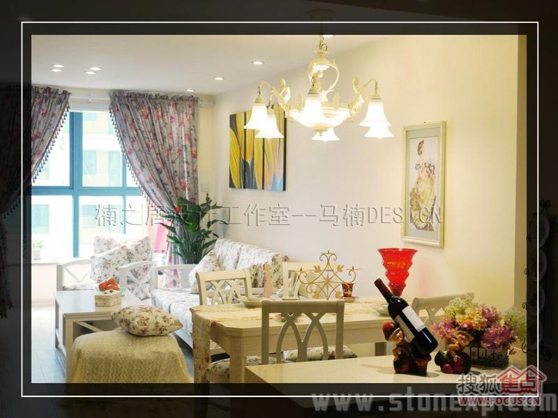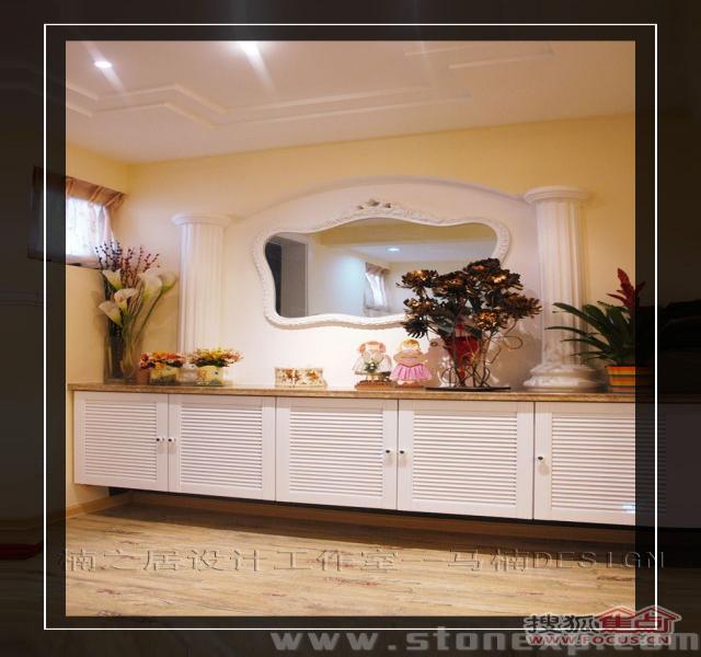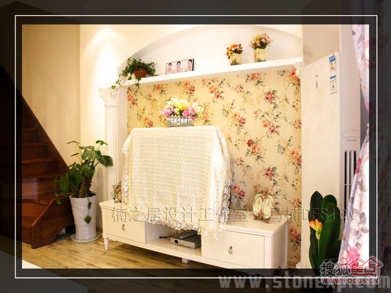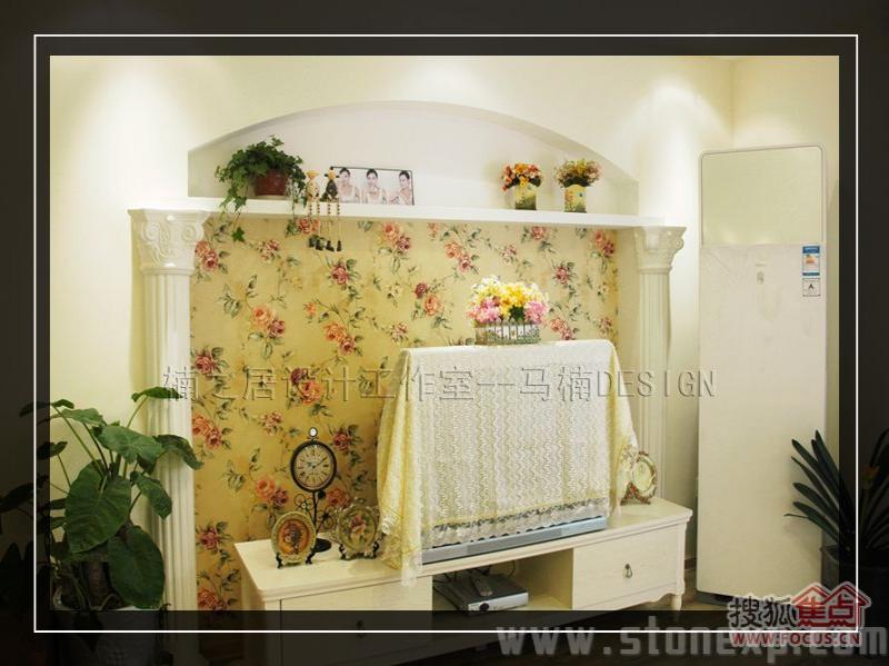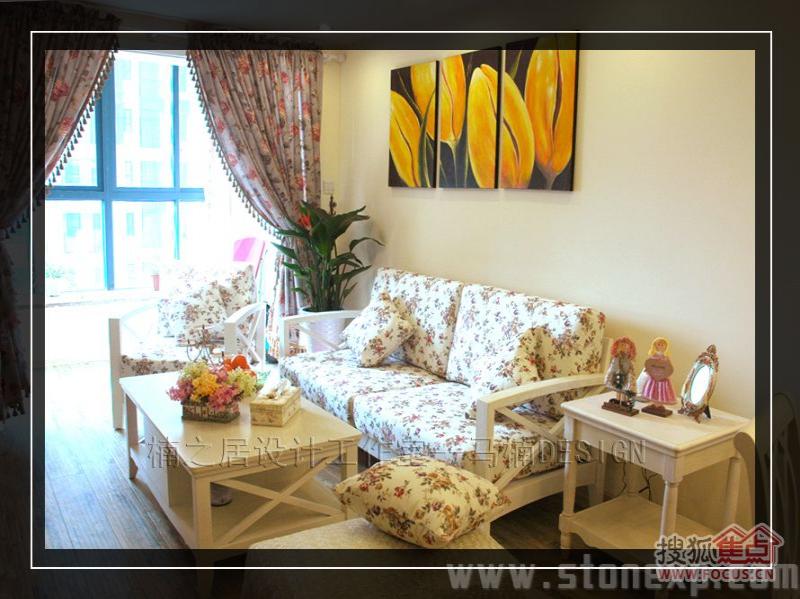 客廳的家具和餐廳配套,白色和碎花相互映襯,沙發(fā)背景墻上金色郁金香圖案的裝飾畫增添了一絲藝術氣息,電視背景墻上的擱架上放著吊蘭、女主人俏皮性感的寫真,這一切都透露著濃濃的生活氣息。