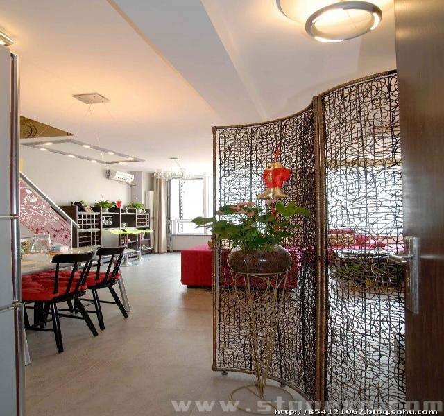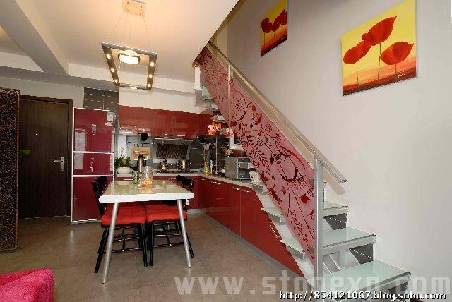 門廳,采用一滕制玄關(guān),一進(jìn)門透過玄關(guān)隱隱約約看到客廳給色的沙發(fā)。廚房采用開敞式設(shè)計(jì),是時(shí)尚簡約新理念在實(shí)際生活中的應(yīng)用。主人多半會把大部分精力放在工作上,每天烹調(diào)的時(shí)間不多,所以開敞式廚房設(shè)計(jì)適合其生活規(guī)律。把廚房和餐廳融為一體,實(shí)用美觀,使空間更加開闊,空間更加連續(xù)。而且平時(shí)主人就餐也比較方便,不至于大費(fèi)周章。整體色調(diào)使用紅色,從色彩心理上講,紅色令人興奮,有助于提高烹調(diào)興趣,給主人一個(gè)愉快的烹調(diào)環(huán)境。地面,墻面的瓷磚采用灰色與給色的廚柜交錯,使空間富有韻律感,