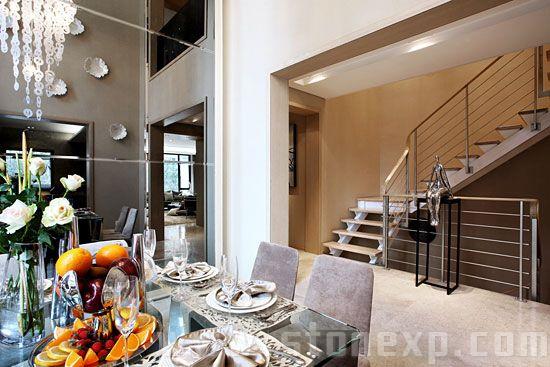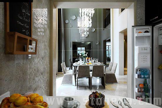 餐廳挑高兩層,清鏡的運用將空間的視覺延伸,精致餐桌布置,生活化的點點細節(jié),讓一切都變得暖暖的。