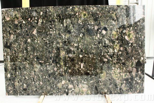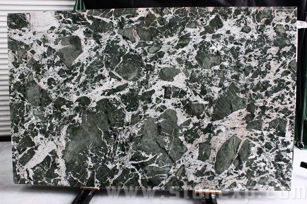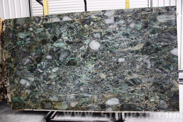 此塊石材因其類似貝殼的水晶體材質(zhì),底色綠中帶藍的獨特顏色近似名貴