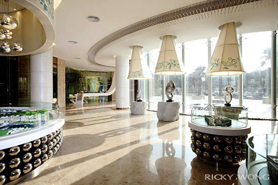 入口處簡潔的概念化服務臺,如水流從墻體的上方緩緩地傾斜下來,背景墻上無數(shù)閃耀的玻璃棒讓人一進門就感覺到海的活力。區(qū)域中央圓形的大吊燈,籠罩著整個展示盤,幾根大立柱以弧形分布,有效地擴散視覺空間,對應展示區(qū)寬闊的氣度。休息區(qū)內(nèi),純白的皮質沙發(fā)同樣以弧形擺放,天花上方打破傳統(tǒng)照明的概念,將海上星空的元素滲透在一根根閃耀的光纖燈里,呼應休息區(qū)的布局,營造出繁星閃爍的夢境之景。