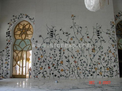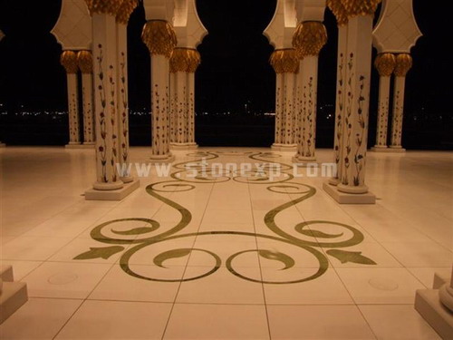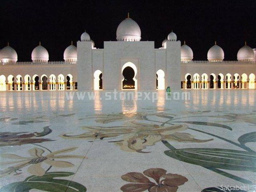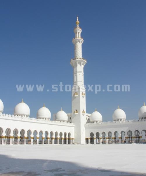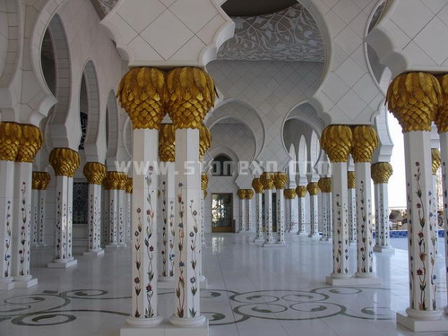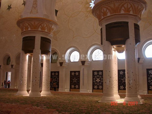 該建筑是為紀(jì)念阿聯(lián)酋開(kāi)國(guó)總統(tǒng)扎耶德而興建,并以其名字命名。是目前世界上最大的清真大廟之一。由香港環(huán)球石材集團(tuán)有限公司提供的貝殼鑲嵌入石材的工藝圓柱,采用垂直流線型拼接工藝,改變了傳統(tǒng)的水刀拼花圓柱直線拼接的方式,該工藝為世界首創(chuàng),已申請(qǐng)國(guó)家發(fā)明專(zhuān)利。