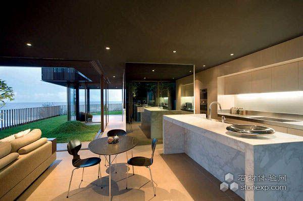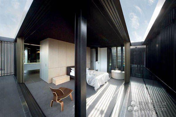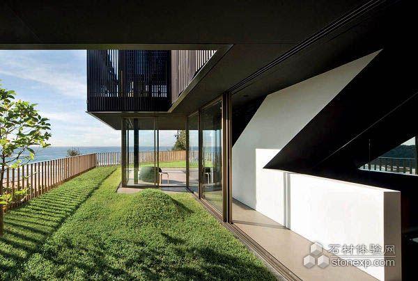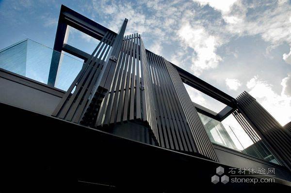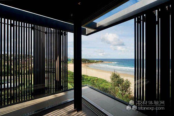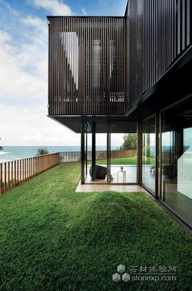 建筑由三個(gè)獨(dú)立部分組成,一個(gè)地下室,一個(gè)花園/生活空間,和一間臥室,臥室被可開啟的百葉幕墻包圍。每個(gè)部分具有獨(dú)特的空間和材質(zhì)。地下室內(nèi)向封閉,利用基地自然地形隱藏凹入口和車庫。二樓包裹著豎向的木百葉,并延伸到一層,成為基地周圍的欄桿。豎向的木百葉欄桿與建筑有一定的角度以便看見沙灘。整個(gè)建筑極具線條感,采用木材,復(fù)合材料和天然石材。