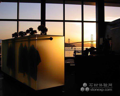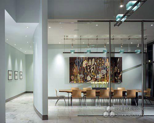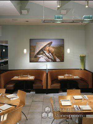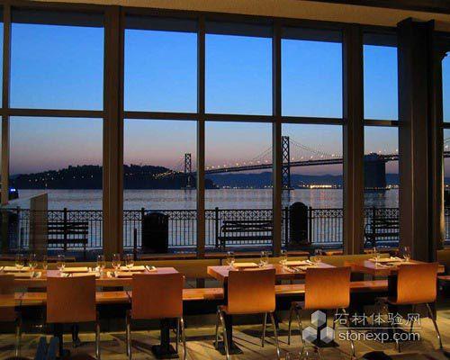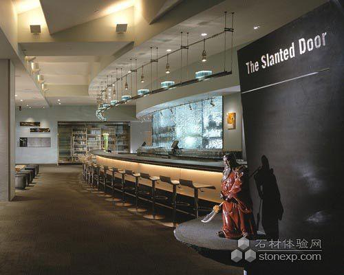 舊金山Charles Phan的餐廳The Slanted Door餐廳設(shè)計。天然的成分,檜木,石材地板,粗鋼和堆疊式平板玻璃建立一個調(diào)色板,優(yōu)雅的玻璃幕墻座椅,接待臺,燈光設(shè)備,以及堆放的玻璃墻。