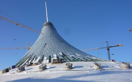 “塞姆波爾建筑公司”很快就要完成室內(nèi)公園、購(gòu)物娛樂綜合設(shè)施——所謂“成吉思汗后裔”(Khan Shatyry)帳篷的工作。這是由福斯特建筑事務(wù)所設(shè)計(jì)的一個(gè)透明的帳篷,其基礎(chǔ)是由英國(guó)的“布羅-哈波爾德工程公司”(Buro Happold)設(shè)計(jì)的索式結(jié)構(gòu)。哈薩克斯坦總統(tǒng)納扎爾巴耶夫?qū)⒂?月6日他的生日那天來主持這幢建筑的落成典禮。
