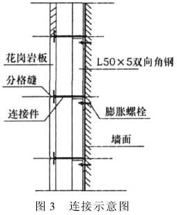 在花崗巖板上下面用無齒鋸開口,開口見圖1,陰陽角示意圖見圖2,開口長50mm,深20mm,開口內(nèi)巖石粉末清理干凈,并注入樹脂膠,用專用掛件將花崗巖板與角鋼龍骨固定,掛件一端連接板材,另一端與角鋼焊接,見圖3。