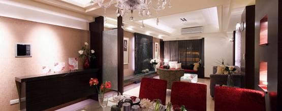 客廳以金米色壁紙勾勒知性氣質(zhì)、電視柜使用懸吊式平臺(tái)設(shè)計(jì),與大理石主墻組構(gòu)嵌合,既保留尊貴穩(wěn)重的視覺(jué)焦點(diǎn),也避免量體過(guò)于沉重。對(duì)稱的藝術(shù)掛畫(huà)、古典雍容的家具線條,加上臨窗巧設(shè)以大紅勾勒的臥榻區(qū),在天花、墻面的間接光源投射下,定義出客廳悠然大度的尺度與個(gè)性。
