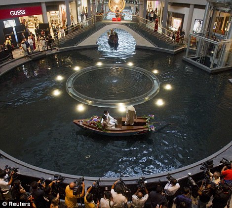 一對(duì)新婚夫婦正在濱海灣金沙酒店購(gòu)物中心的室內(nèi)運(yùn)河上泛舟