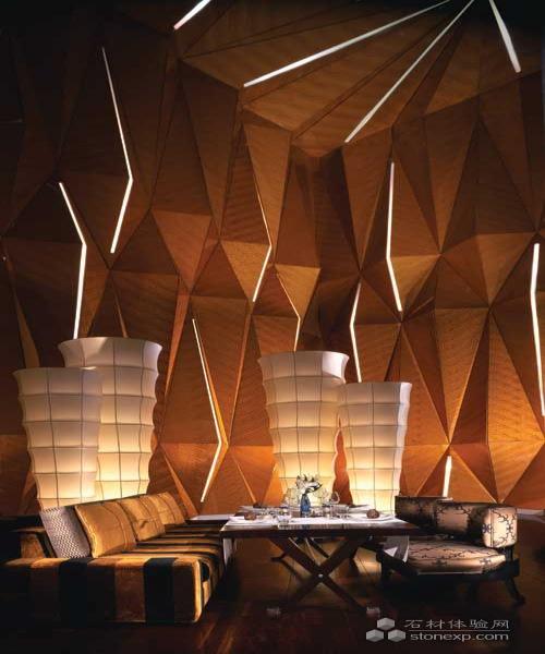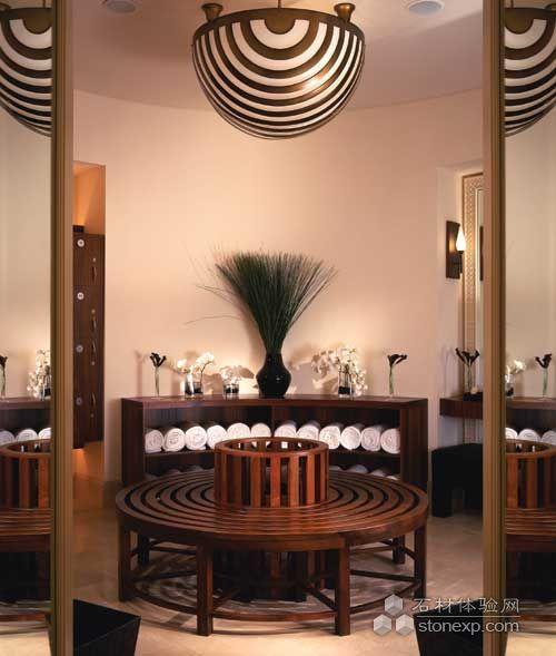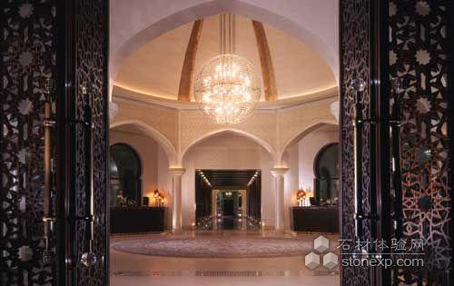 對于酒店室內(nèi)設計的風格要求,業(yè)主對設計師提出了自己的構(gòu)想,他希望柏悅酒店的室內(nèi)風格應該體現(xiàn)多元的地域文化,既希臘、地中海和阿拉伯風格的混合——阿拉伯建筑的極簡樣式中揉入樸素的希臘建筑要素。因此在酒店的大堂設計中,設計師運用了經(jīng)過藝術(shù)手法簡化了蔥頭型的尖拱券和高舉的穹頂?shù)?,這些都是阿拉伯建筑典型樣式元素。并在不同空間的門、窗使用鏤空雕刻,華麗考究;雕花形式上以幾何或植物紋樣為主。也是阿拉伯傳統(tǒng)手工藝再演變。這些元素不僅在不著痕跡的表露出酒店的地域特點,同時也營造出阿拉伯民族的神秘色彩。