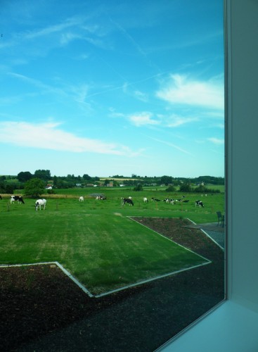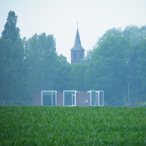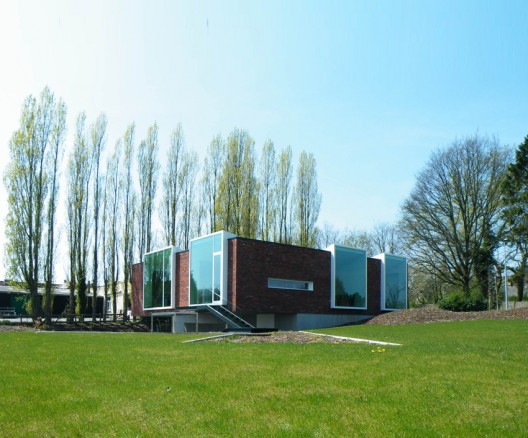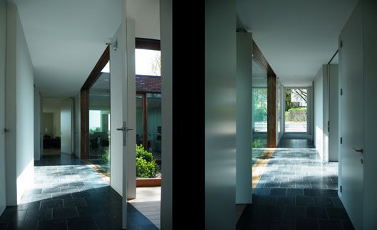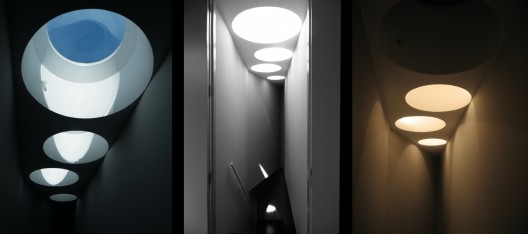 這種中性通過粗糙的磚結(jié)構(gòu)實現(xiàn),房屋沖街和餐館的一面半遮蔽著;建筑的入口處是白色的鋼板結(jié)構(gòu),穿過這個白色的空間,來訪者會進入一個走廊,走廊可以俯瞰下方右側(cè)的露臺。