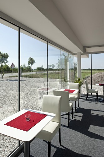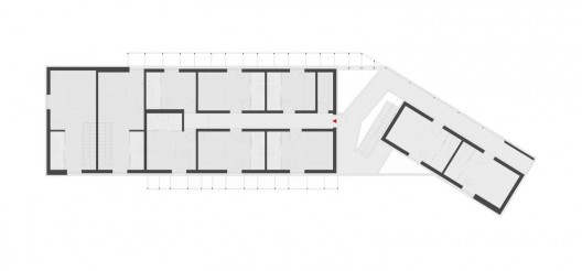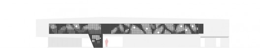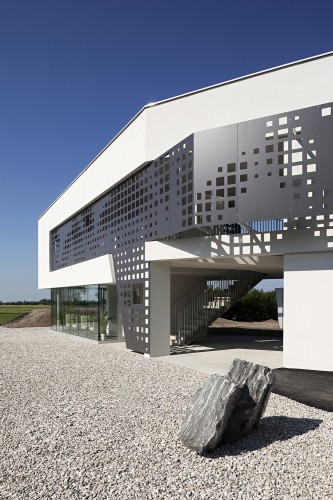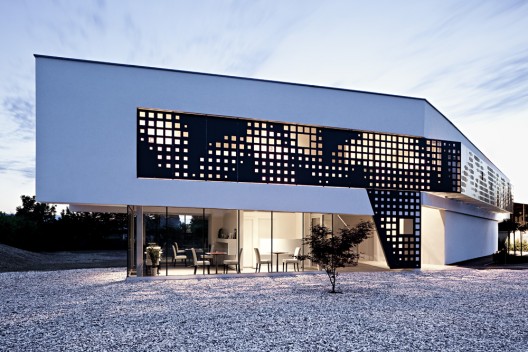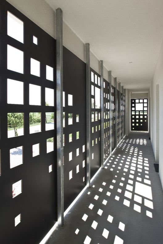這個(gè)兩層的建筑有一個(gè)向外突出的長鼻子結(jié)構(gòu),一層有臥室,二層表面有一條鮮明的穿孔黑金屬帶,酷似建筑的徽標(biāo)。