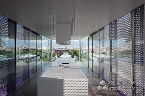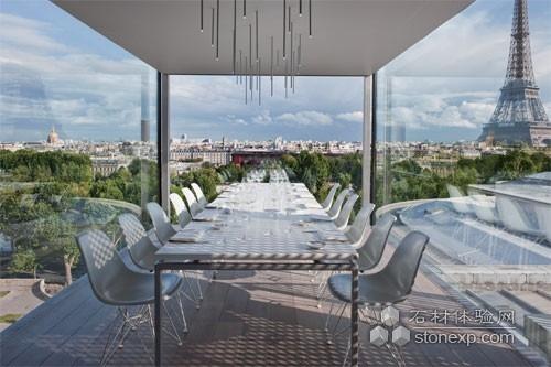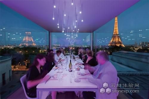 餐廳擁有一體化的大型操作臺(tái),集合了盥洗、烹飪、就餐三個(gè)主要功能于一身。它擁有獨(dú)特的使用功能和良好的視覺效果,縱向展開,迎合了整體條形的建筑空間。而這個(gè)“長桌子”同樣可以抽象看成一條活躍的線,縱情的劃出自由裝飾的語言。由此,空間幾何語言就被積極地組織起來,所有的元素都圍繞著它,在此過渡展開。站在內(nèi)部空間放眼望去,玻璃盒子外一片美麗景致,著名的塞納河與艾弗爾鐵塔盡入眼簾,無論白天與夜晚,景致隨著色彩的改變,給餐廳內(nèi)部的人們帶來了不同的心情,白天豁然開朗,神清氣爽;夜間神秘冥靜,深邃幽然,還有什么比這天然的景致更適合作為裝飾元素?